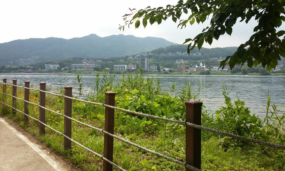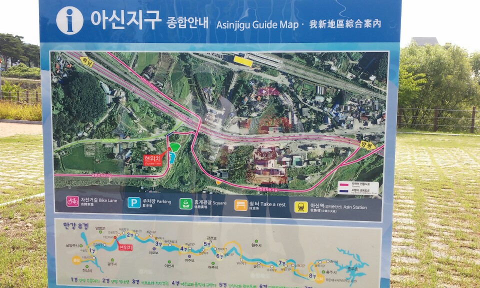 전에 갔던 길 그대로 강가를 걸어서 갔다. 휴일이라 자전거타는 젊은이들이 많다. 지도를 보니 자전거종주가 충주까지 갈 수 있다. 아신역이 보인다. 강아지와 같이 가니 자전거타는 사람들이 신경이 쓰여서 산책하다가 다시 돌아나왔다. 강가를 걷는 길은 어디를 가도 시원하다.