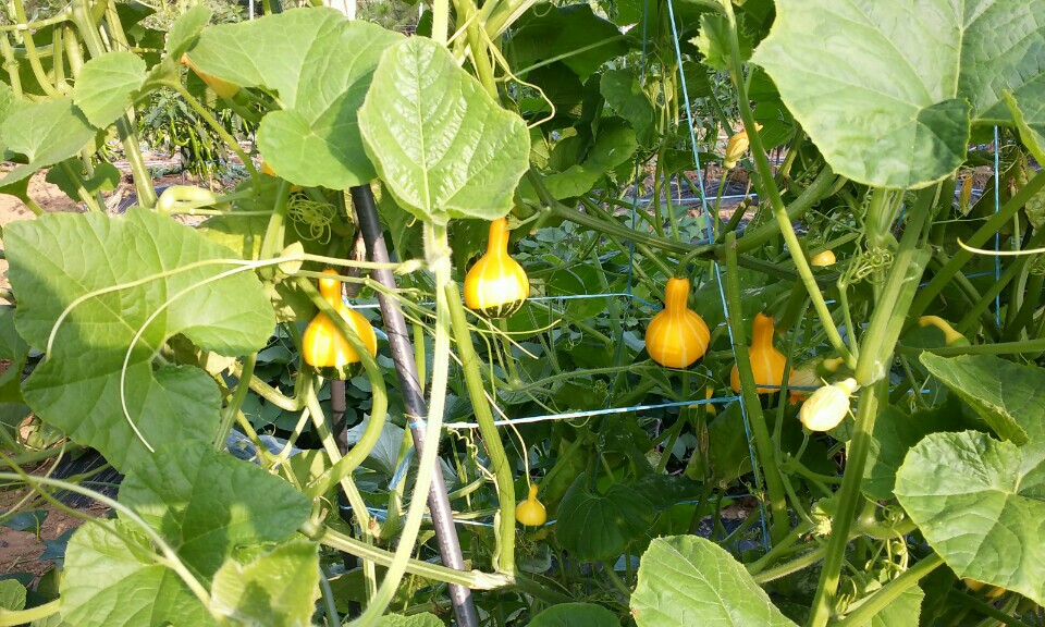 친구가 주어서 심은 칼라조롱박이 이파리 사이사이에 숨어있기도 하고 자신을 드러낸 것도 있어 텃밭을 신비롭게 한다.