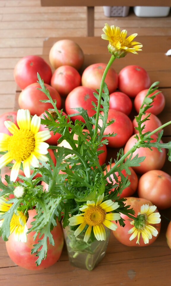 익어가는 토마토를 탁자위에 놓아두면서 익는 모습을 보고 다 익은 것은 먹는데 쑥갓꽃과 같이 사진을 찍으니 새롭다.