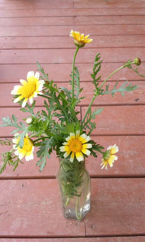 쑥갓잎을 따오면서 꽃을 잘라왔다. 유리병에 꽂았더니 꽃을 사다가 꽃꽃이한 것처럼 보인다.