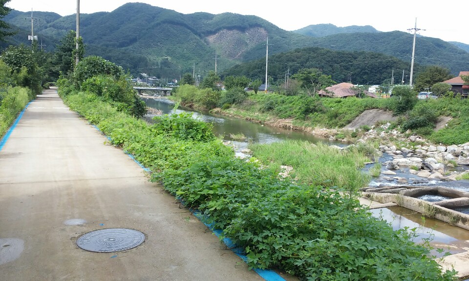 사당이 있고 주차장이 넓은 곳이 있어서 주차장에 주차를 하고 마을로 들어서서 걷다보니 돌아나오는 다른 길이었다. 도로 맞은편에 하천이 있는 것 같아 둘어가니 용담천 자전거길이었다.
