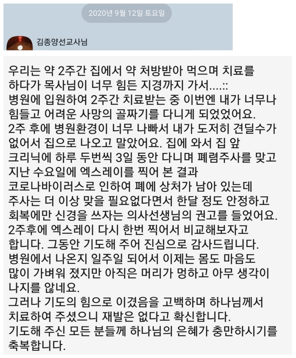 | 김종양 박상원 선교사 코로나로 투병 3, 아들 편지 (0) | 2020.09.07 |
