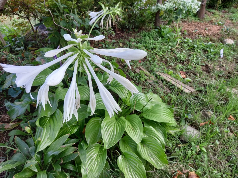 나무밑처럼 그늘도 있고 습도도 적당한 곳에서 잘 자라는 것도 있다. 우리집 비비추나 옥잠화는 복숭아나무 근처에 자리를 잡았다. 진한 향기를 내뿜는 하얀 꽃이 가을 정원의 한 부분을 장식한다. 마치 브로치같다.