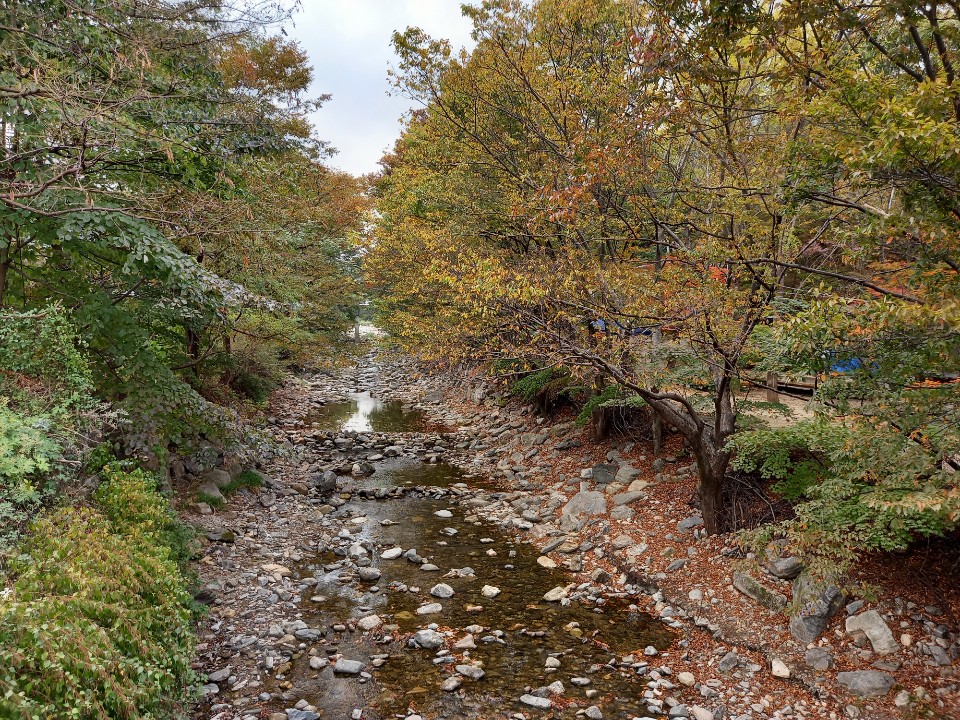 개울가로 내려가는 길을 발견하여 물가에서 강아지는 물 먹으며 놀고 우리는 간식을 먹으며 쉬었다. 단풍들어가는 나무들의 모습이 물가를 아름답게 해준다. 아무렇지도 않은 자연스런 모습이 참으로 더 아름다운 것이다. 꾸미지 않았으면서도 멋진 모습을 드러내기가 쉬운 게 아니다. 그런 걸 요즘 표현하는 방법으로 '안꾸꾸'라고 해야하나. '안꾸안'이라고 해야하나.