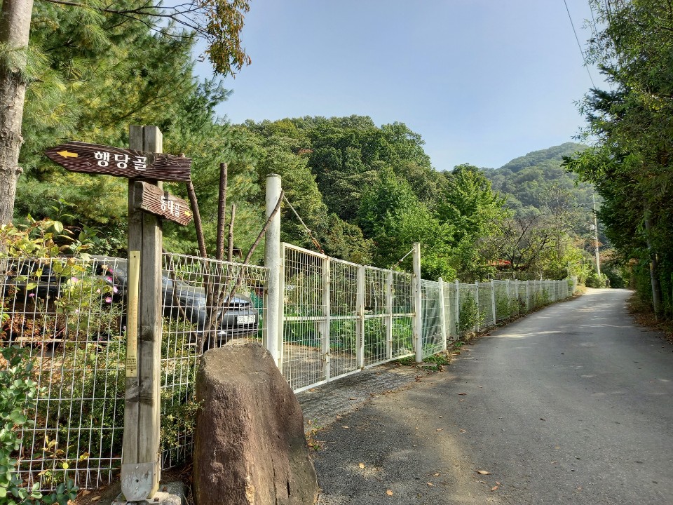 띄엄띄엄 주택이나 식당, 펜션이 있고 여유로운 마을이다. 들깨를 잘라서 말리는 받들이 여러 집에 있고 집들은 오래전에 지었는지 무척 넓고 크다. 북대골길이 아닌 곳으로 걸었다. 한참 걸으니 동대골과 행당골 표지판이 나왔다. 그 중에서 어디로 갈까 하다가 동대골로 걷는다. 요즘은 어딜 가나 밤나무 밤송이가 떨어져서 밤 줍는 재미에 산책이 지루하지 않다.