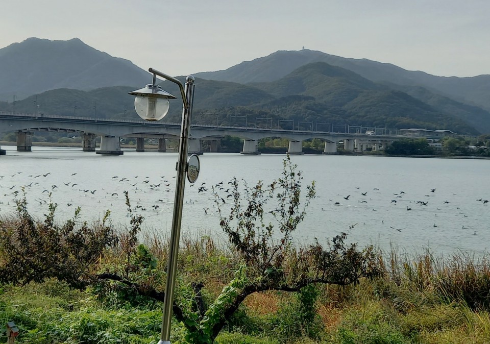 강물 위로 갑자기 수십마리 새떼들이 수면위를 날아가는 걸 보고 마구 찍었는데