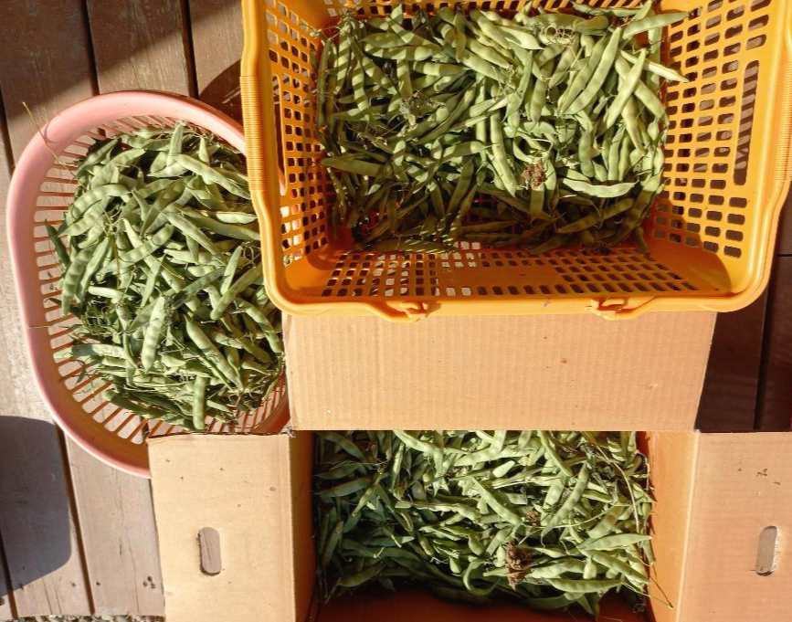 마당을 정리하기도 해야해서 울타리콩 줄기를 모두 잘랐다. 잘려진 울타리콩줄기에는 파란 꼬투리가 주렁주렁 매달려 있다.