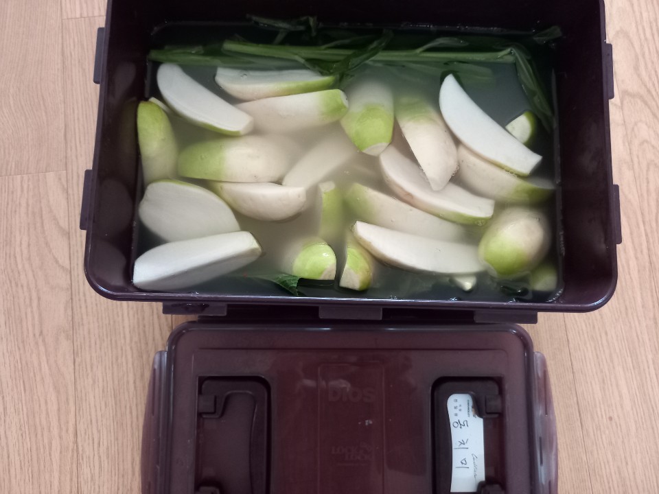 대충 해서 먹는 게 내 성질이라서 어쩔 수 없다. 그렇지 않으면 물을 얼마나 넣어야 하나 고민하며 머리가 아플 수도 있으니까. 무를 갈라서 하니까 돌로 눌러둘 필요가 없어 좋다.