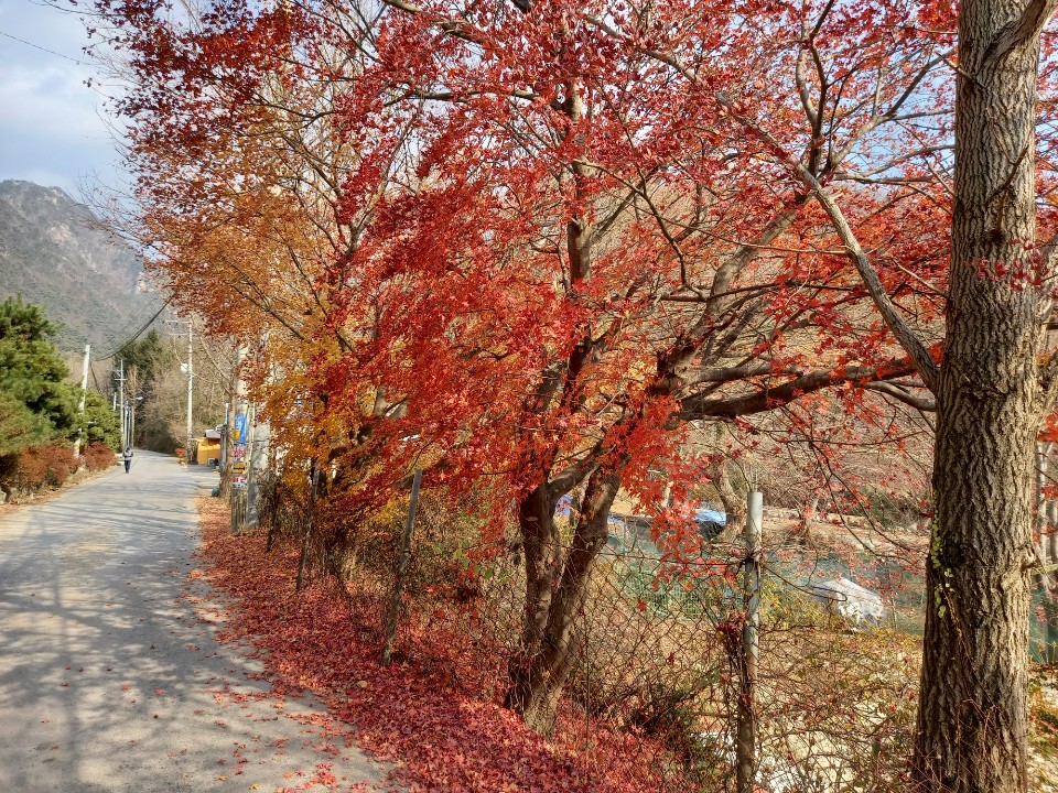 계단으로 내려와서 계곡을 따라 걸으면서 빨간 노란 단풍나무를 배경으로 사진을 찍었다. 남겨진 사진은 몇 번 보고나면 잊혀지겠지만 휴대폰에 남겨져 있다는 것으로 위안을 삼는다.