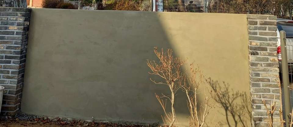 벽돌을 쌓아 울타리를 만들었다. 울타리를 한 줄로 쌓아 좀 약해서 안쪽 벽에 미장을 하였다.