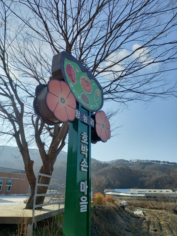 망능리 호박손 마을 회관을 지나 한참을 들어가 보니 곳곳에 펜션카페가 있다. 도로표지를 보니 괘일산 등산로 가는 길, 요셉의 집 가는 길, 잔치마당펜션 가는 길이다.