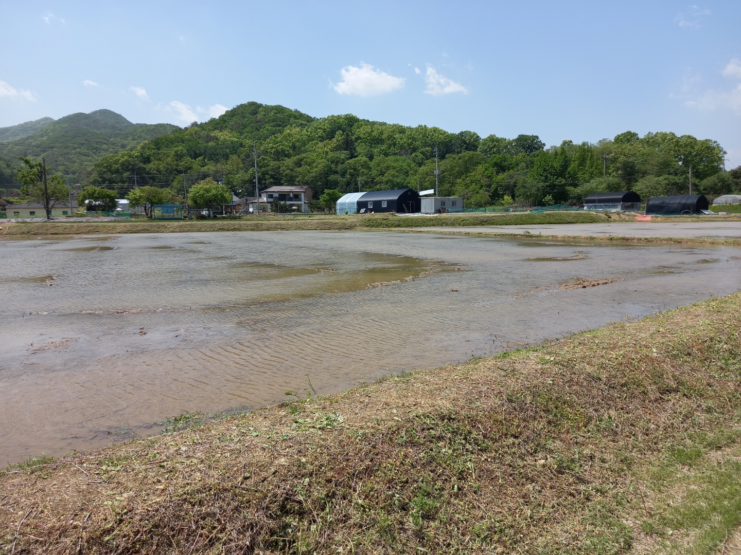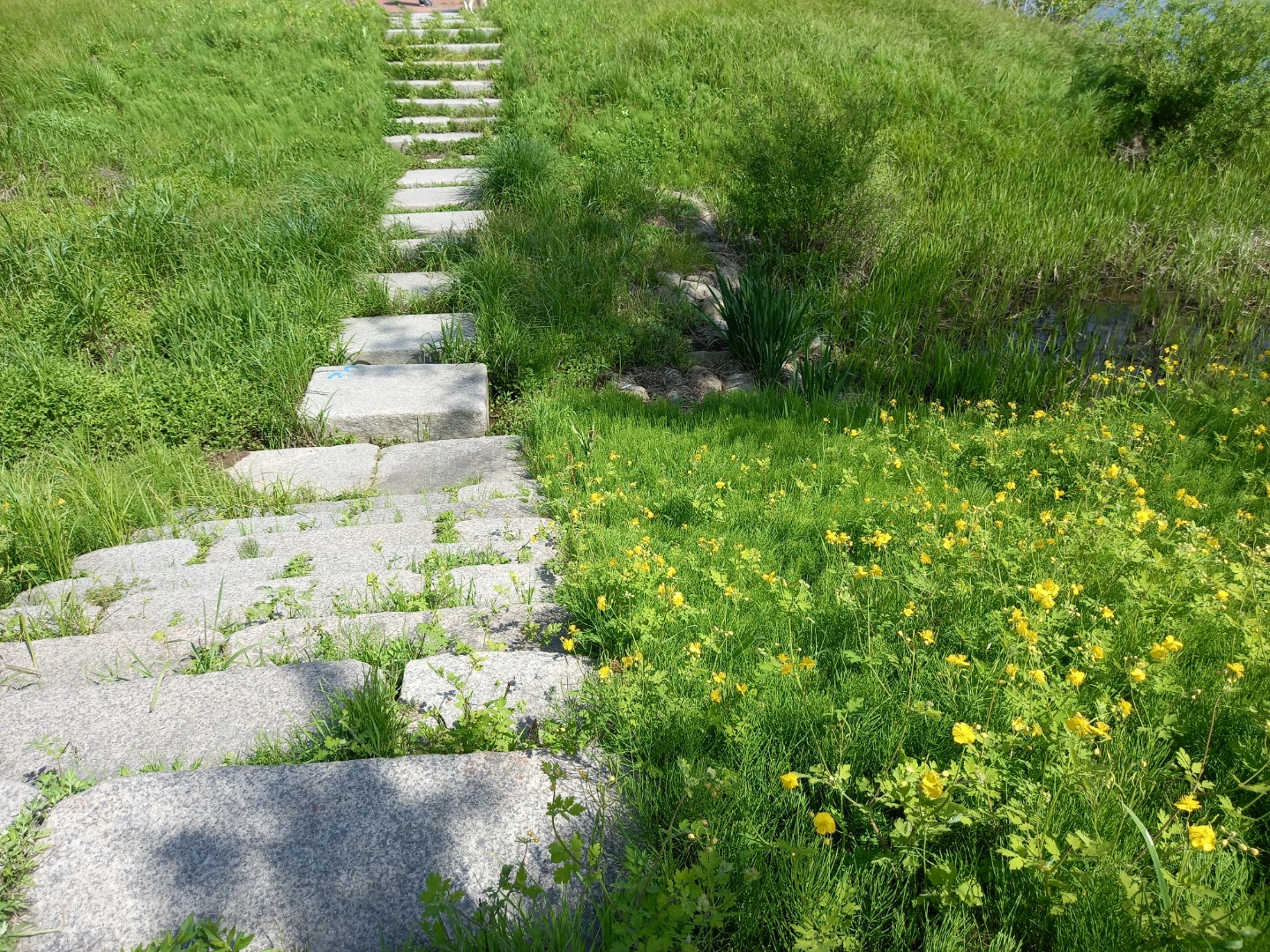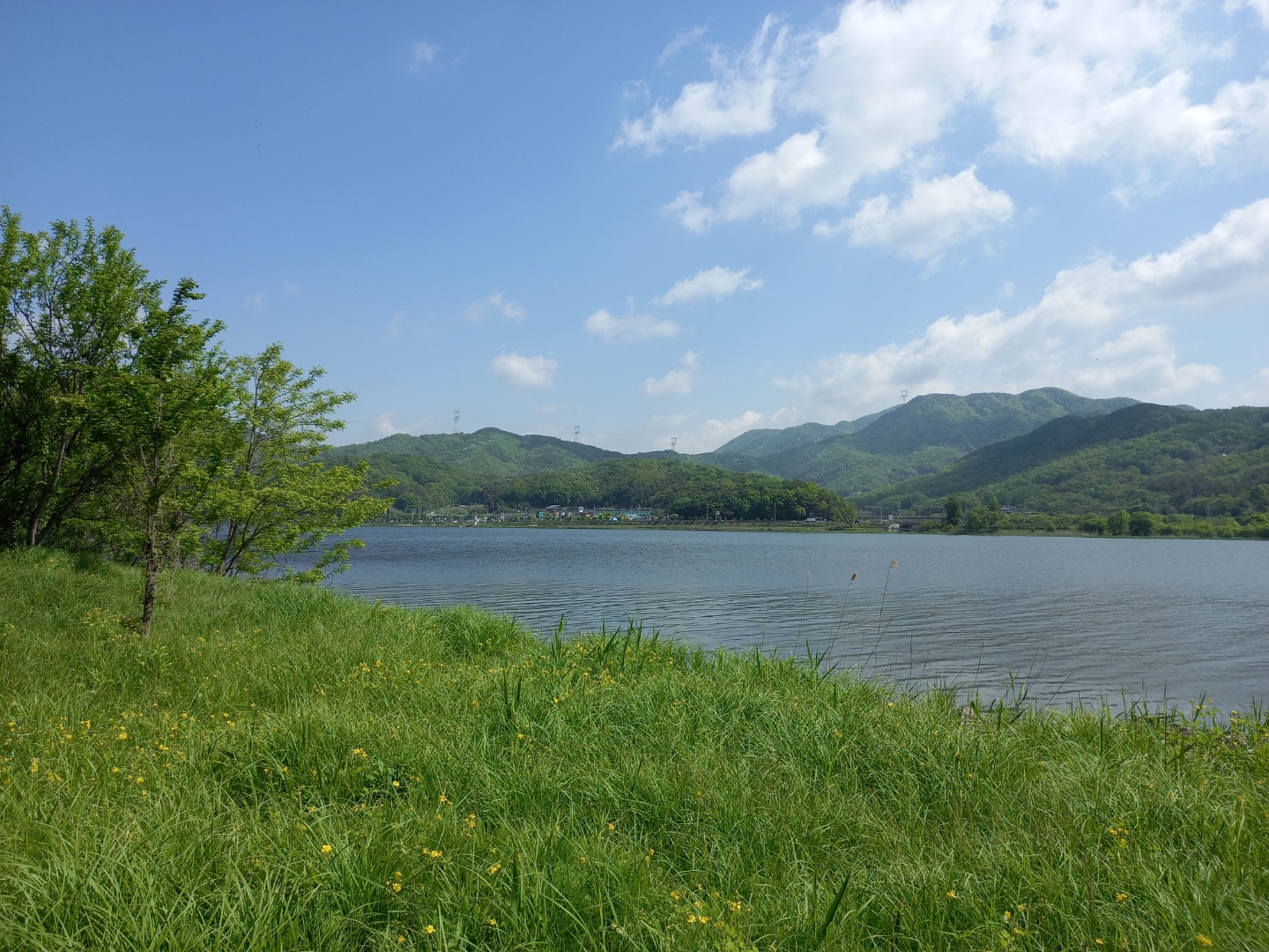 검천3리쯤 되는 곳일까 아니면 검천 3리 가기전쯤일까. 강변으로 내려가는 곳을 찾아 근처에 주차를 하였다. 내려가기만 하면 강변길은 만족이다. 강을 옆에서 바라볼 수 있다. 논에 물을 가득 대어놓은 것을 보니 때가 되면 모내기도 할 것이다. 가을의 누런 벼이삭 풍경까지 상상하며 즐겁게 걷는다. 쉼터도 가끔 나타나니 쉬면서 커피와 간식을 먹는다. 어떤 쉼터는 광장을 만들어놓고 둘레에 앉을 곳이 원을 그리듯 했는데 풀이 가득 나서 앉을 수가 없었다.