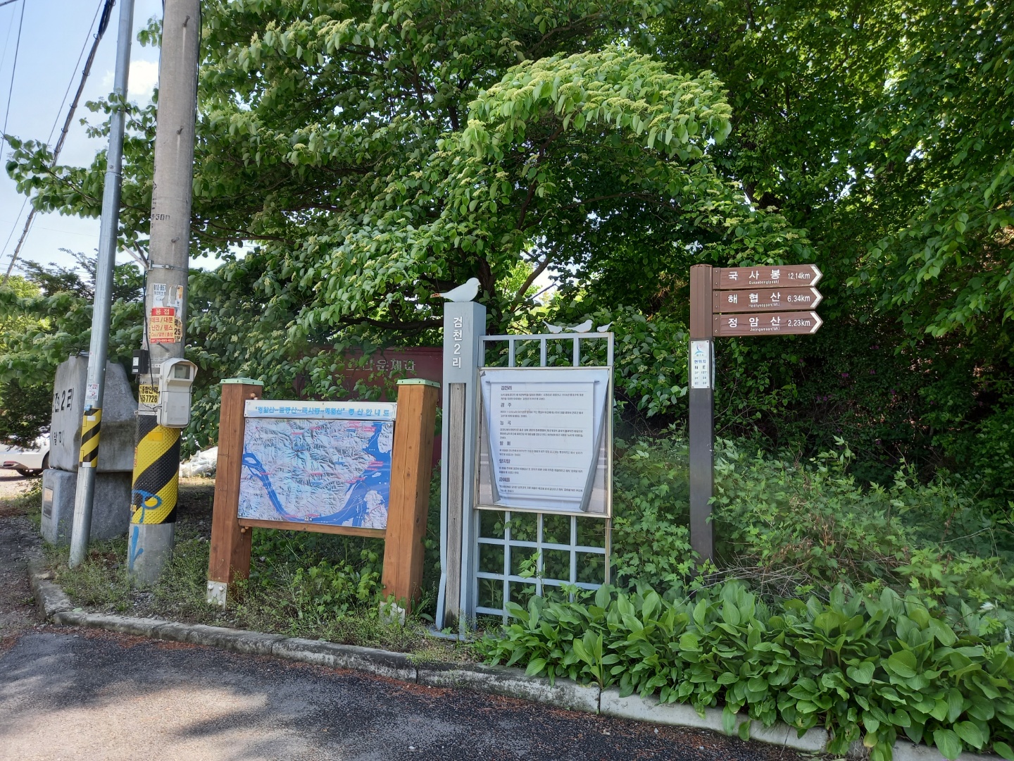 한참을 걷다가 아주 튼튼한 두터운 돌계단이 있어 올라갔다. 벤치도 있고 도로가에 가보니 검천2리다. 장암산으로 올라가는 길 입구 안내판도 보인다. 때가 되면 다시 와서 강가가 아닌 장암산으로 가볼 생각이다. 주차장도 있고 화장실도 있어서 다음엔 이곳 검천2리에서 시작해서 물안개공원 방향으로 걸어가면 될 것같다.