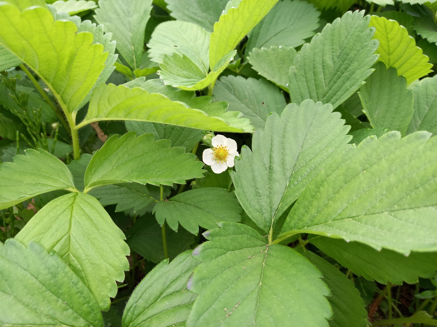 꽃밭의 또 한 구석에는 딸기가 줄기를 뻗어가며 자란다. 거름을 봄에 많이 주어서인지 이파리가 작년보다 크다. 하얀 꽃이 하나 피어서 사진을 찍어 두었다.