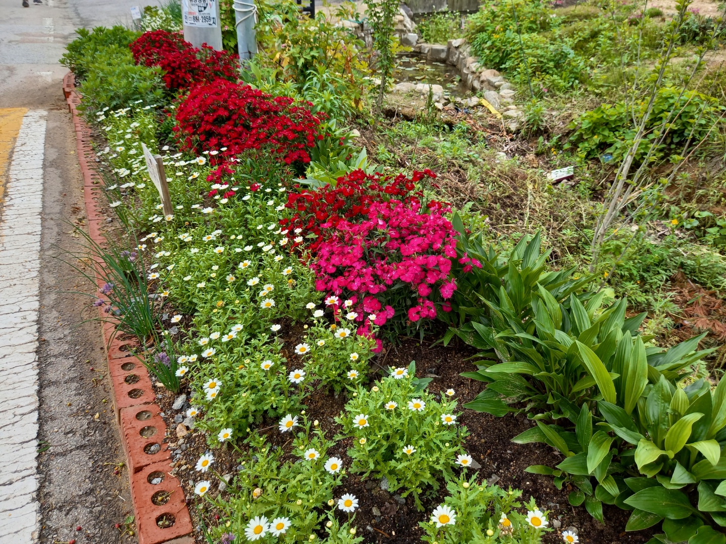 도로가에 개울물길이 있다. 가장자리에 인도는 없고 인도를 만들 자리에 꽃을 심어 가꾸고 있다. 지나가는 차가 많지 않아 갈만하다. 도로가를 꽃길로 만드는 정성을 높이 사고 싶다. 시니어클럽이 가꾸는 것이라는 푯말이 꽂혀있다. 이름까지 적혀있어 이채롭다.