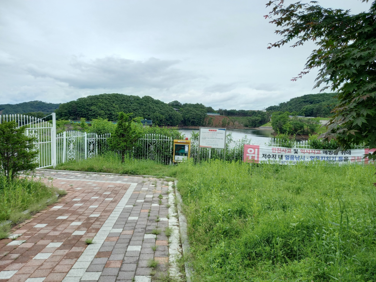 도로 왔던 길로 올라가서 저수지 주차장에 주차하고 산책길을 찾아보았으나 통로 문을 잠가놓은 상태다. 저수지는 농업용으로 2010년에 만들었다.