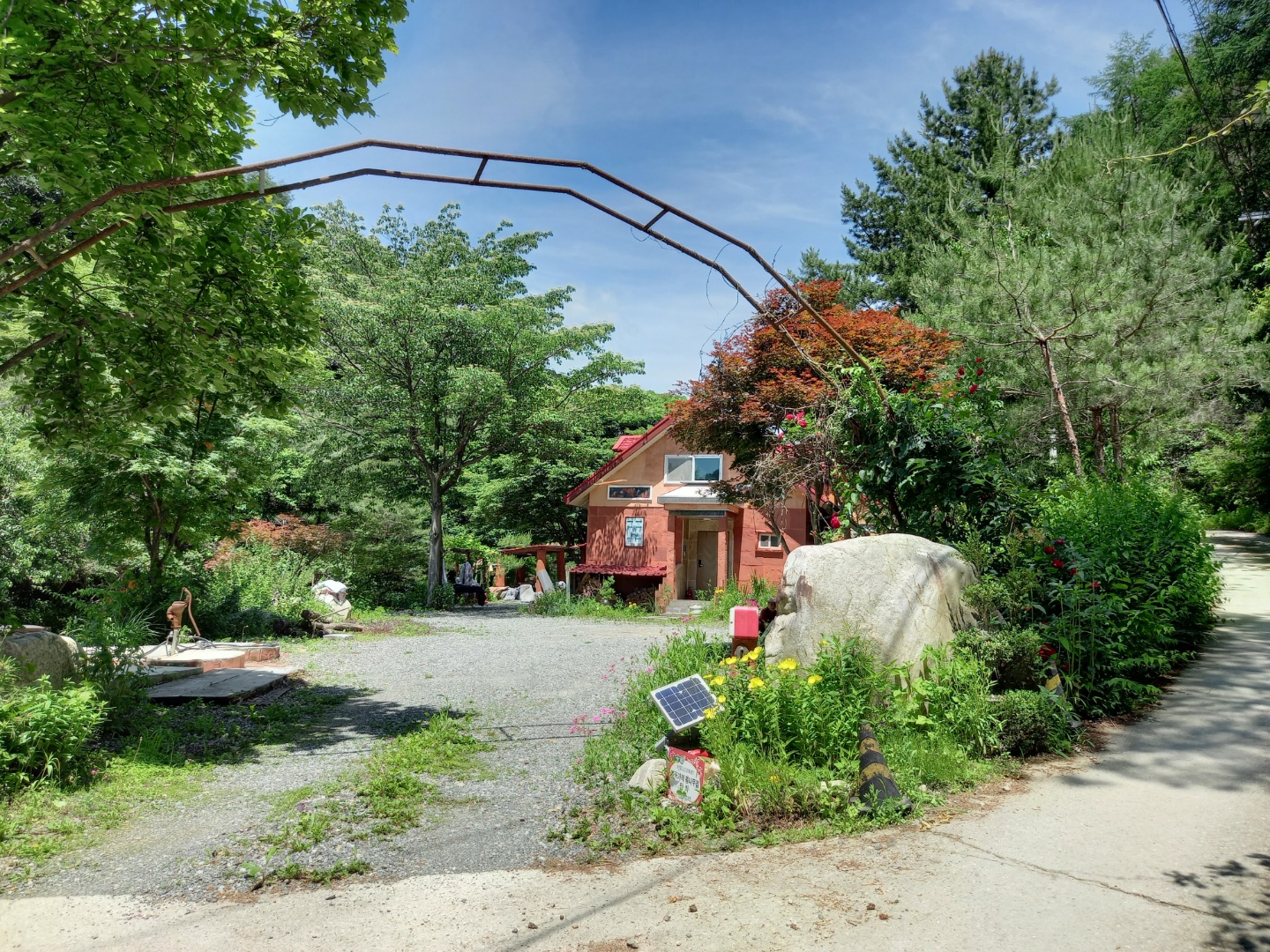 개울길을 따라 걷는 길에 산방이라는 이름을 단 소박한 집이 있었다. 황토로 벽을 했는데 매끈하게 하지 않고 거칠게 한 것이 멋스럽다. 내가 사진을 찍으니 주인장이 “뭐 볼게 있다고 찍느냐?”고 한다. 나는 “왔다 간 기념으로 찍는다.”고 했다. 겸손하신 분이다. 집앞과 마당에 꽃도 자연스럽게 심어 가꾸고 계신다.