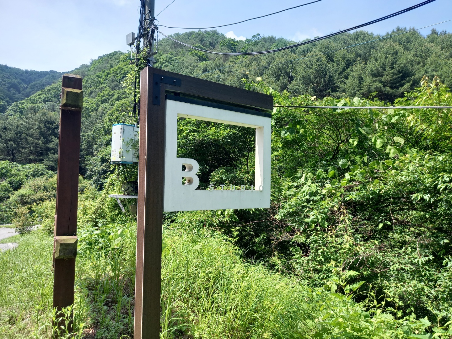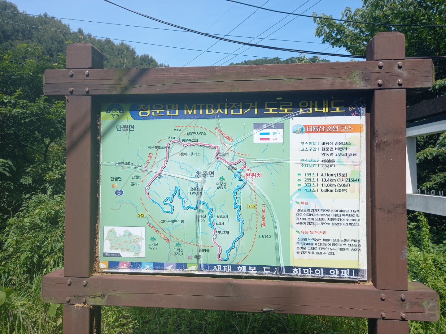 되돌아 나와서 5분정도 지나니 삼거리가 나왔다. 근처에 주차를 하고 오른쪽 도로로 갔다. 오른쪽 넓은 도로는 청운면을 한바퀴 도는 곳이다. 자전거를 잘 타는 사람들은 청운면을 한 바퀴 돌면 좋을 것이다. 자동차로라도 가보면 좋겠다. 그 길을 벗어나 우측으로 장수마을이라는 푯말과 비스투디오 간판이 있어서 볼거리가 있을 것 같았다. 등산로 안내판이 있어서 등산을 좋아하거나 한다면 유용한 안내판이다.