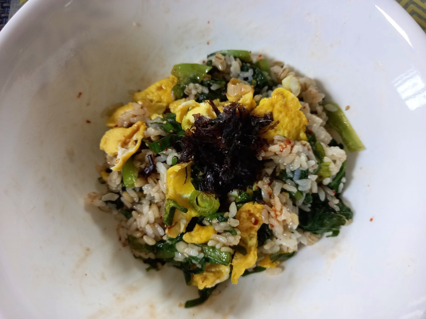 상추밥위에 계란을 얹고 남아있는 김가루도 얹어서 비볐다. 계란은 대파를 볶다가 깨뜨린 계란을 부치면서 살살 뒤집어 엄지손가락만큼 크기로 부쳐진 것이다.