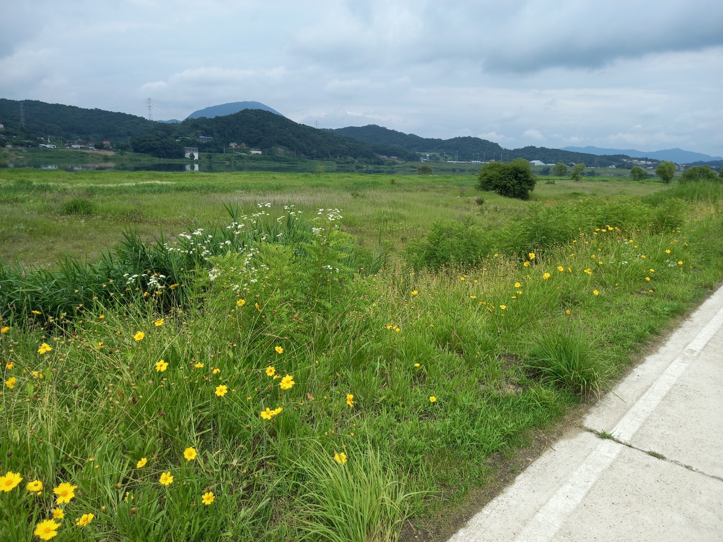 강가에 정미소가 있어 차량이 다닐 수 있는 도로인 것 같다. 요즘 어디서나 보는 금계국이 드문드문 피어 있다. 한창 때는 지난 것이어서 그렇다. 산책길의 표지판을 보면 꽃내음거닐마당, 전망대쉼터, 생태습지(전북)이다. 전에 전북리유원지입구에서부터 걸을 때 지나쳤던 습지다. 내려가지 않고 자전거도로로 만들어놓은 길로만 산책을 했다.