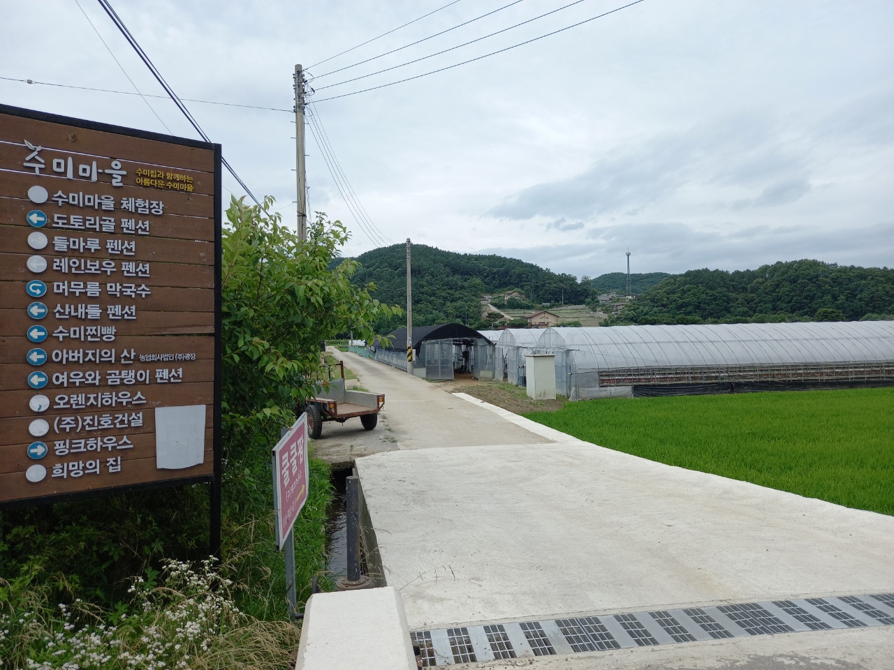 오른쪽길로 꺾으니 쿨쿨팜펜션(구 핑크하우스)가 네가지 이상의 칼라로 벽을 칠해서 멀리서도 잘 보인다. 흑천을 바라보며 걸을 수 있는 산책길이 뒤편으로 있어서 가보니 그 펜션의 뒷마당이 보였다. 텃밭 농사도 같이 지으며 사람들을 맞이하는 모양이다. 옥수수들이 여기저기 많이 자라고 있다. 여름에는 역시 옥수수가 대세다. 키도 크고 맛있는 옥수수도 주니 말이다.