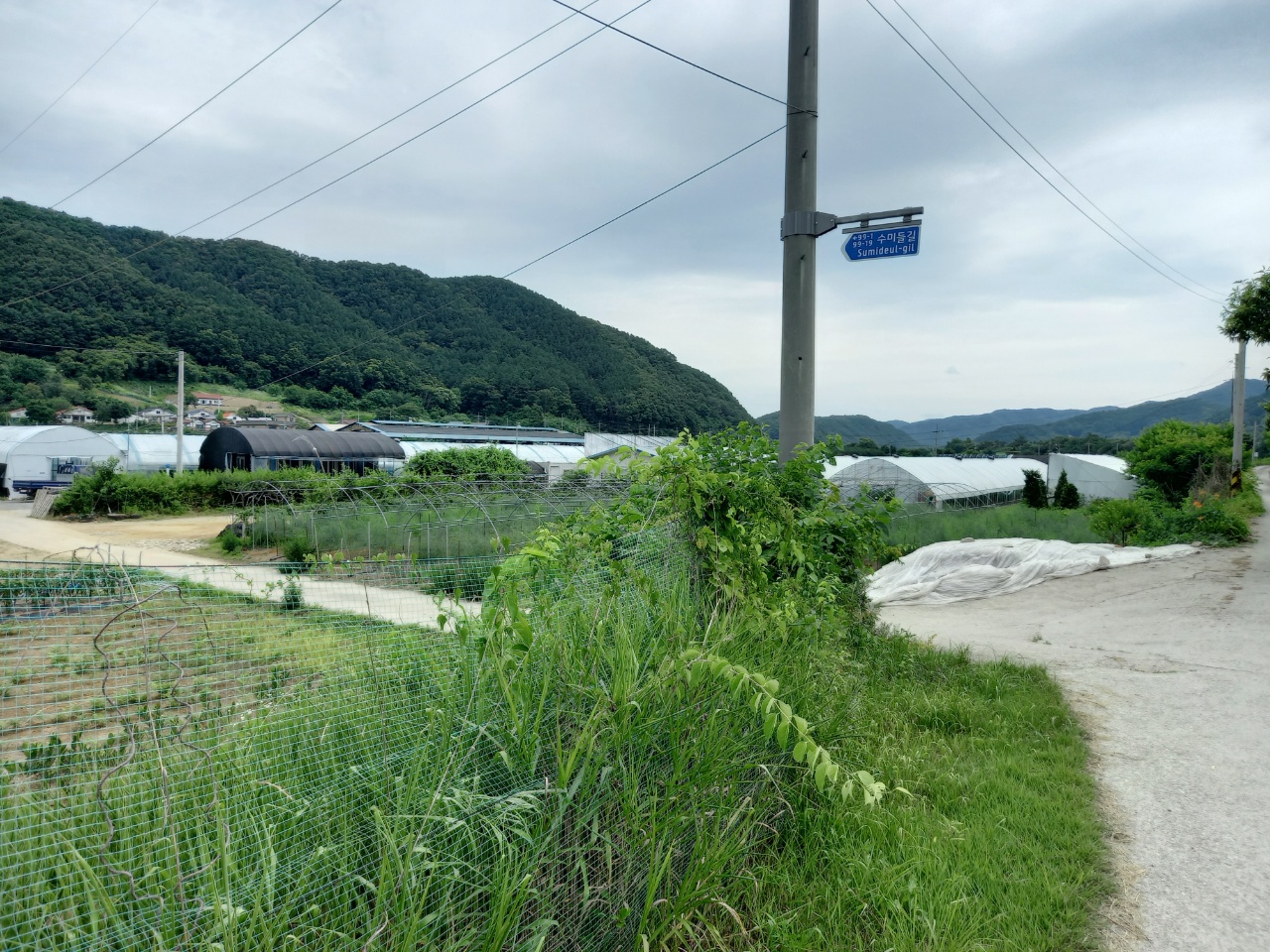 오늘의 산책은 오른쪽의 마을에서 했다. 농로를 걸어가며 파랗게 자라는 벼들의 작은 하늘거림이 예뻤다. 주황색 알들이 줄기에 붙어있는 것도 있다. 우렁이알들이다. 친환경으로 농사짓는 방법의 하나다. 비닐하우스에서 수조같은 곳에 무언가 있어 가까이 가보니 우렁이를 키우는 곳이었다.