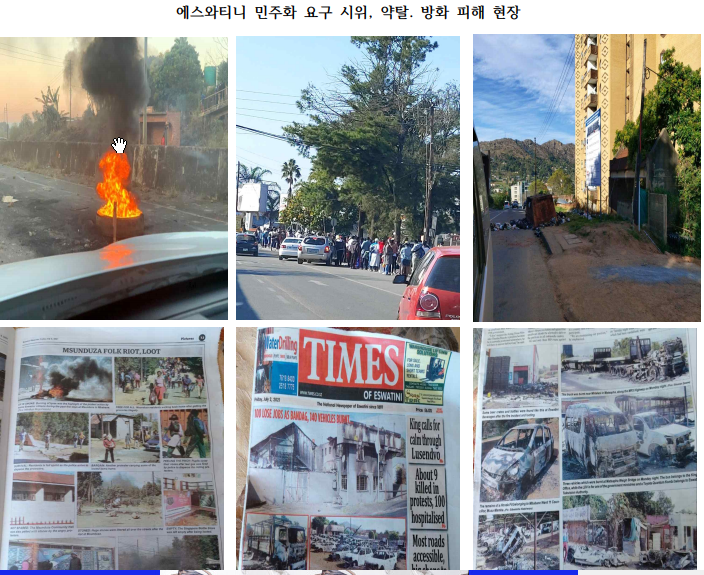 저희들이 에스와티니에 거주하는 동안 몇 번인가 데모가 일어났지만 이번 폭동처럼 크게 번진 것은 처음 입니다. 거리에는 마약에 취한 중학생정도의 나이 어린 청년들이 떼를 지어 크고 작은 상점 안으로 들어가 약탈하고 세워놓은 자동차들을 불태우는 등 며칠간 거리는 마치 전쟁을 치룬 듯한 분위기가 되었습니다. 저희가 살고 있는 음바반에는 밤마다 며칠 동안 총성소리가 끊이지 않고 있으며 당분간 집안에 머물라는 정부의 지시가 있어서 주민들이 출근을 못하고 있는 가운데 먹을 것을 구할 수가 없는 주민들은 큰 불편 속에서 생활을 하고 있습니다.
