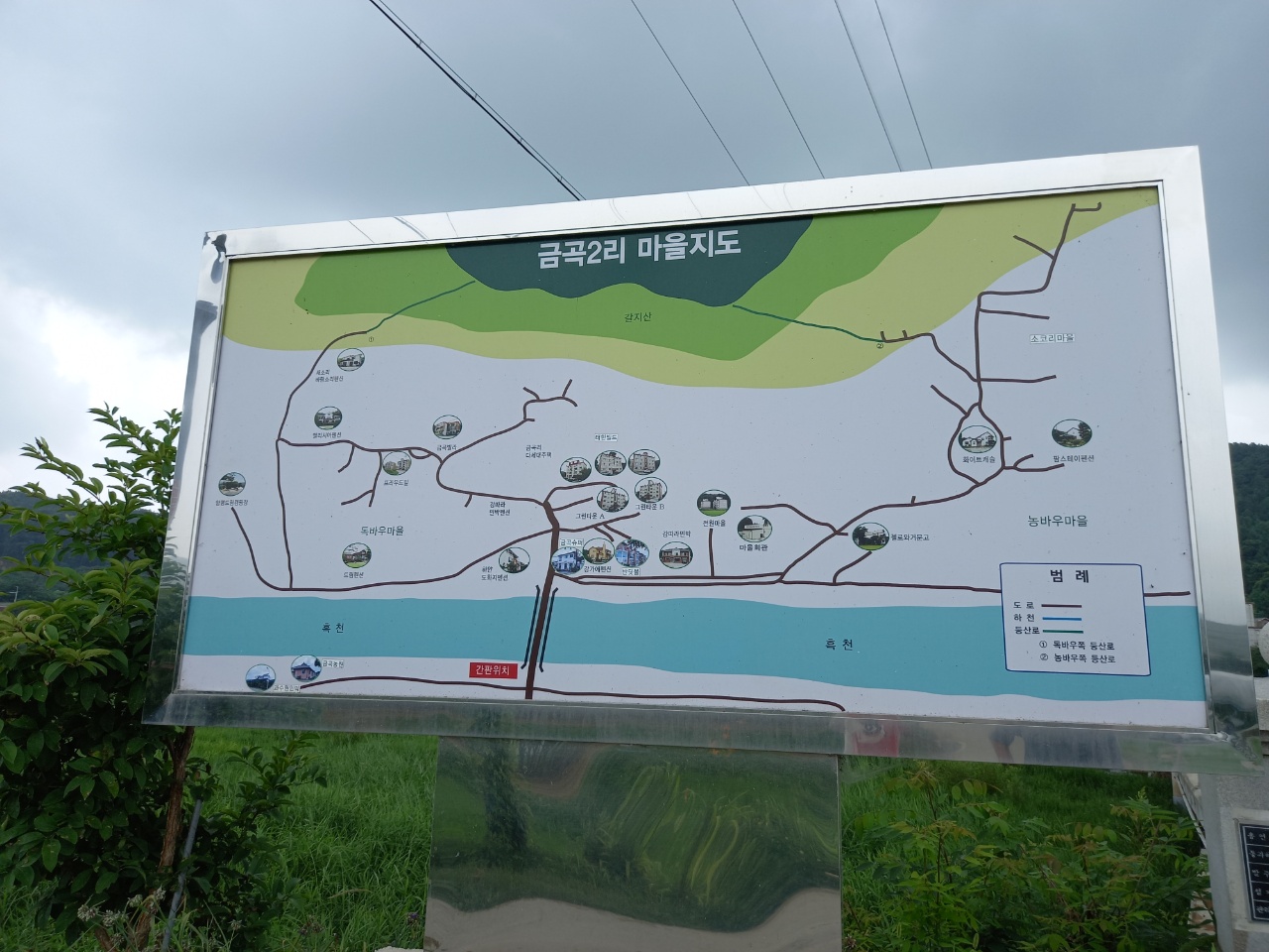 오며가며 꽃과 나무 사진을 찍었다. 섬초롱꽃이 매달려있는 모습, 꽃같지 않은 방울모양이 매달려있는 나무덩굴도 보았다. 금곡교에 휴대폰분실 용지를 붙여놓은 것도 있다. 찾고자하는 마음, 안타까운 마음이 함께 한다. 금곡2리 마을지도를 보니 다시 한 번 더 와야겠다.