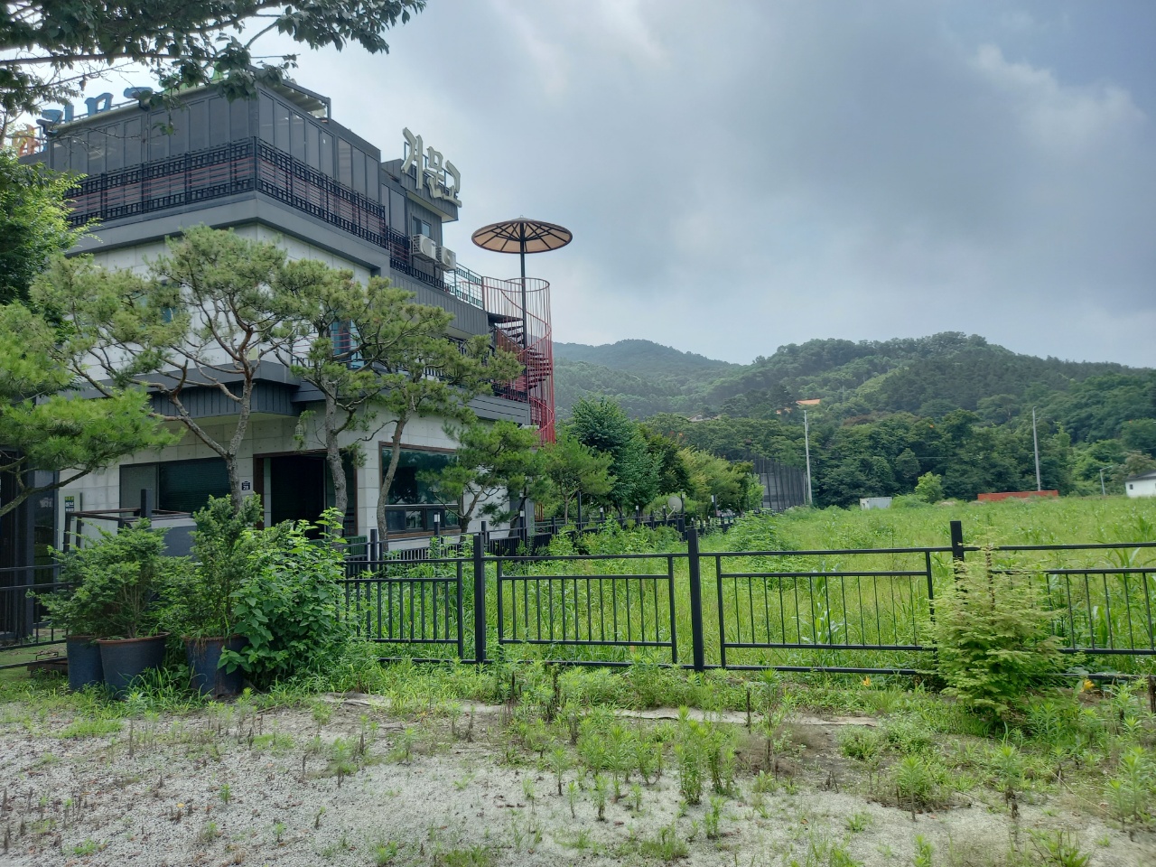 조금 더 걸으면 매우 넓은 땅에 꾸며놓은 펜션이 보인다. 이름도 첼로와 거문고이다. 입구 지붕에 거문고가 하나 올려져있는 모양이다. 숙소의 이름도 첼로동 거문고동 이다. 운동장도 보이고 따로 떨어져있는 또 다른 첼로와 거문고 숙소가 보인다.