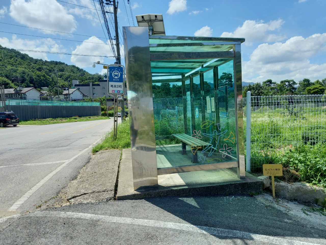 복포2리 마을회관을 지나 남한강변길에 복포2리 버스정류장이 보였다. 마을회관은 어딜 가나 모습이 비슷하다. 빨간 벽돌집이다. 버스정류장도 그렇다. 위치를 알 수 있는 좋은 지점이긴 하다.