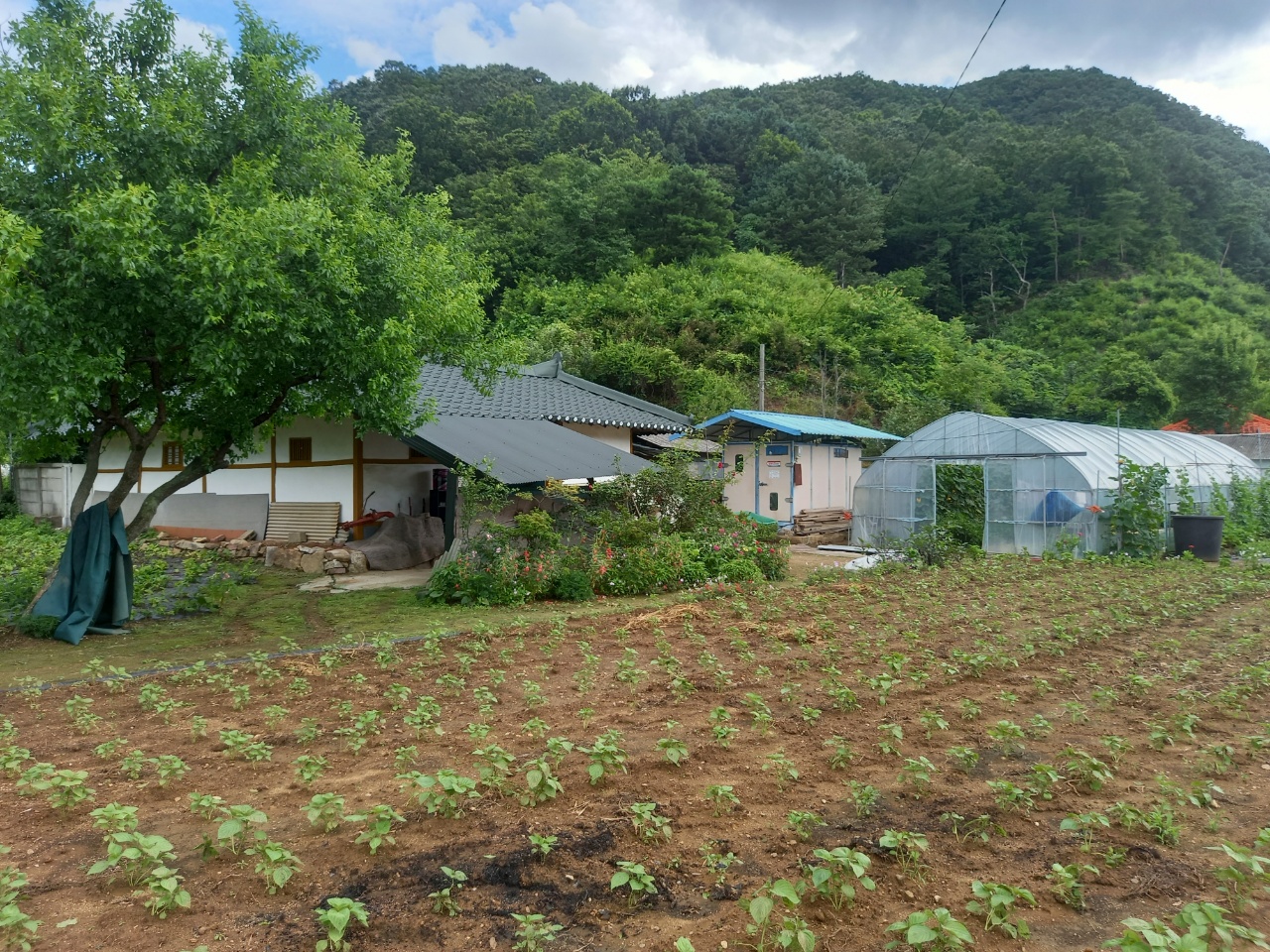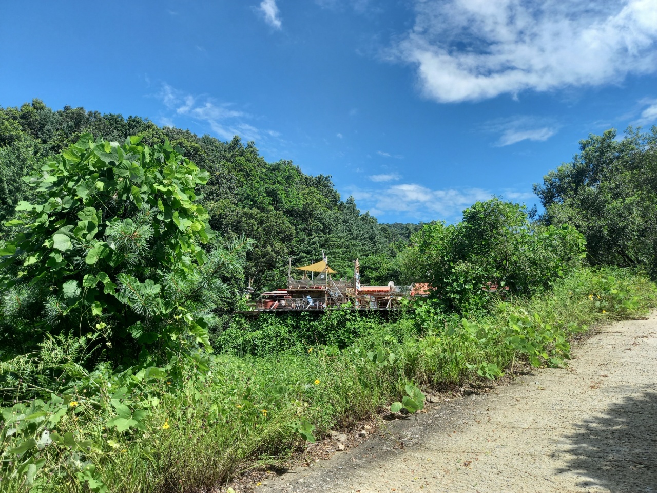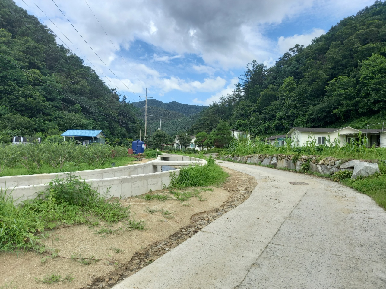 내려오는 길에 개울이 있다. 개울의 석축을 시멘트로 높이 올려서 정비해놓은 것은 홍수에 대비한 것으로 보인다. 자연과 어울리지는 않지만 필요한 시설이다. 어디를 가나 파란 하늘과 뭉게구름이 풍경의 멋을 더해준다. 줄 맞추어 심은 들깨 모종이 풍성하게 밭을 채울 때쯤이면 가을날의 선선함을 느낄 수 있게 될 것이다. 넓지 않은 자투리 땅의 논에 파랗게 자라는 벼도 누렇게 보탤 것이다.