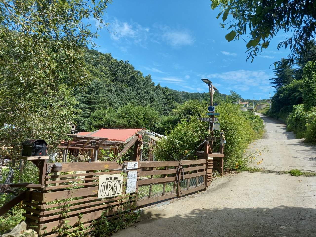 조금 가파른 언덕길로 올라서서 가는 길에 방부목으로 울타리를 듬성듬성 가로로 댄 주택을 만났다. 개인주택이 아니고 숙박시설이었다. 호텔이라는 표지가 보였다. 더 갈 수도 있으나 날씨가 더워서 다음에 더 갈 생각을 하면서 뒤로 돌아섰다.