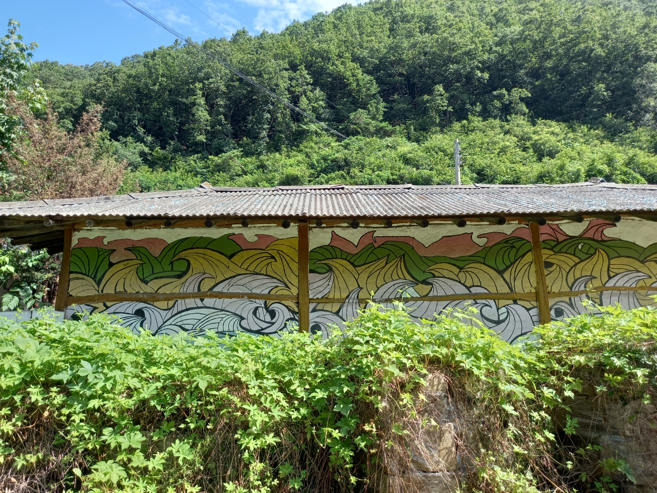 산책하자면 늘 신경쓰이는 게 주차할 곳이다. 다행하게도 봉상2리 마을회관앞 주차장이 좀 넓고 비어있어서 마음놓고 주차를 할 수 있었다. 왼쪽길로 가다가 멋진 벽화가 그려진 스레트지붕의 오래된 집을 만났다. 단순하면서도 추상적인 디자인의 그림을 그려넣었을 화가의 마음을 만난 것 같아 더 기분이 좋았다. 집 앞으로 허름한 담장에 자연스럽게 자란 넝쿨과 어울린다.