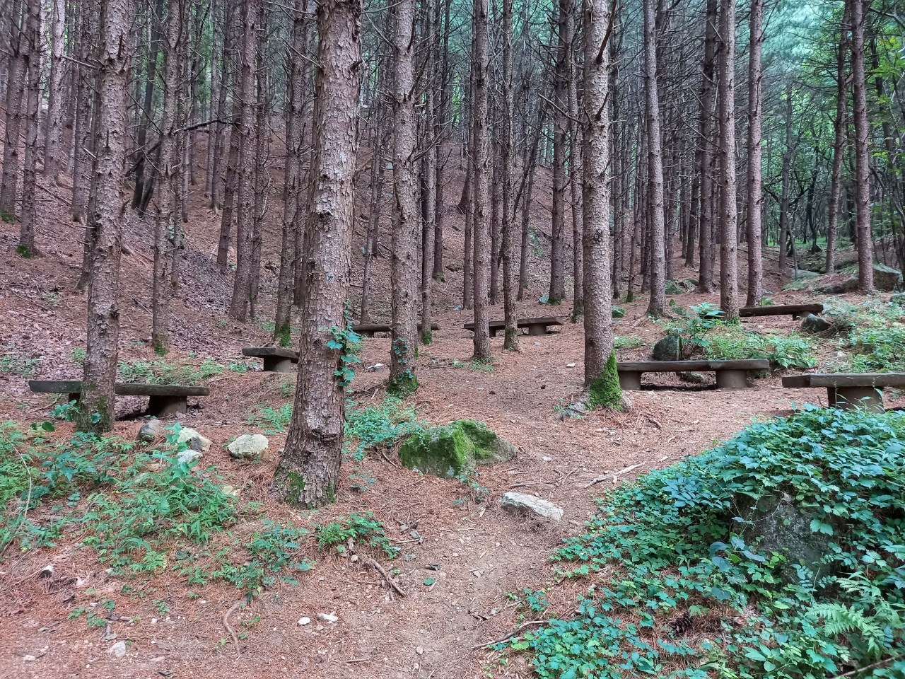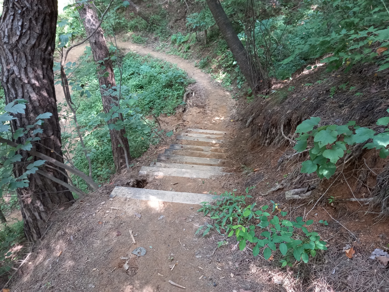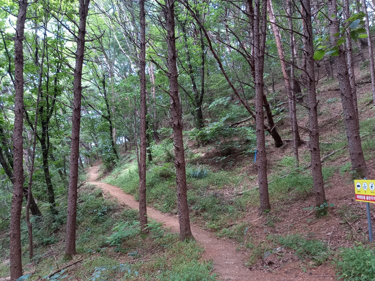나는 올라가는 숲길을 걸으며 감탄을 하였다. 꼭 필요한 곳엔 방부목으로 계단을 만들고 경사진 길은 대관령가는 길처럼 지그재그로 해서 경사도를 낮추었다. 사람도 없고 나뭇잎으로 가려져 하늘도 안 보이는 곳이라 썬그라스도 필요없다. 골짜기에는 맑은 개울물이 조금이지만 흘러서 강아지가 목을 축일 수 있다. 오솔길처럼 아늑한 숲길에 빠져들었다.