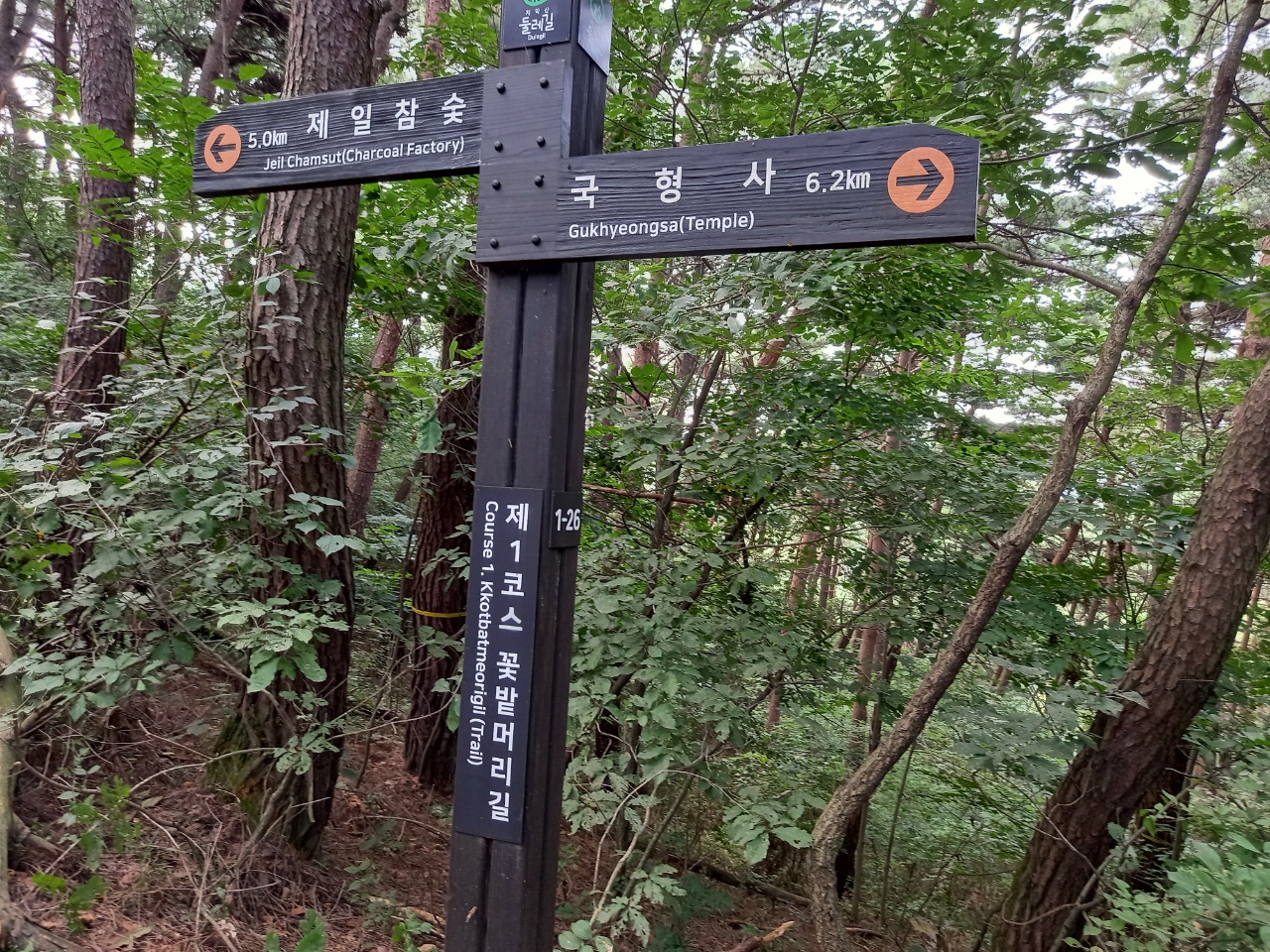 안내판을 보니 관음사로 가는 방향은 운곡 솔바람 숲길이라고 해서 잘 정비된 흙길이다. 맨발로 걸을 수 있는 곳이라 반려견을 같이 동행할 수 없다.