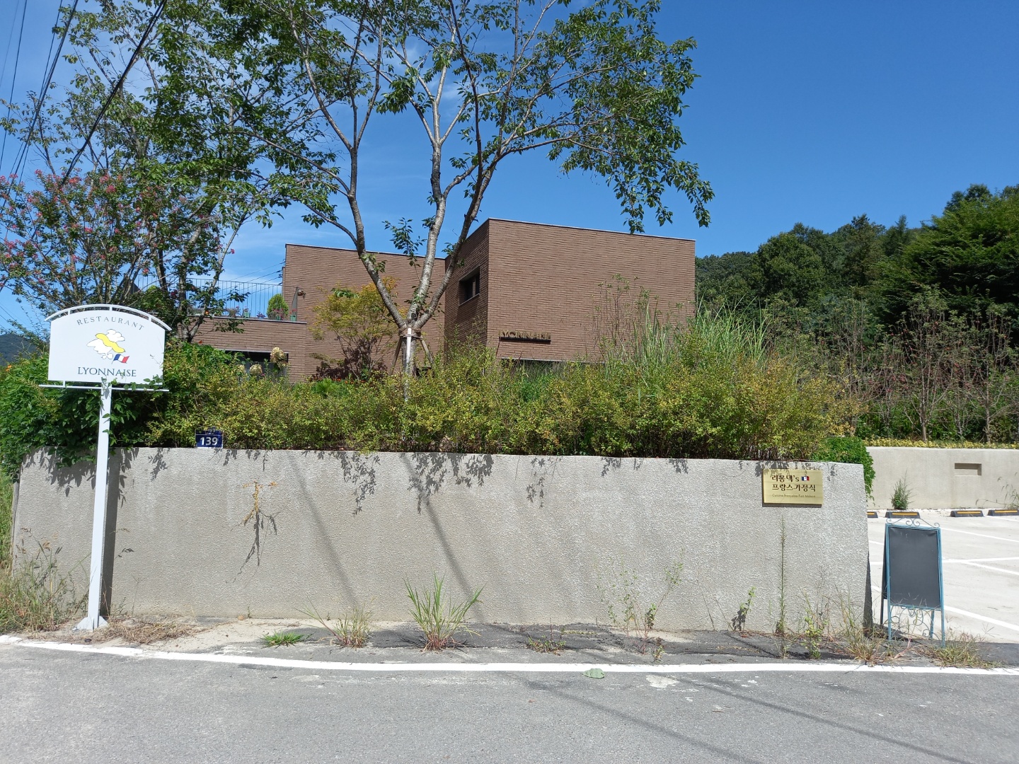 깨끗한 길을 걸으며 특색있게 지어진 집들이 풍경과 합쳐져 품격을 더한다. 대추카페도 있고 글램핑캠핑장도 있고 이름을 알 수 없는 집도 있다. 프랑스식 가정요리 식당도 있다. 들어가보고 싶다. 오리학교라는 오리전문점 간판도 보인다. 골프연습장을 지나 언덕길로 올라가면 교회수양관이 있다. 요즘은 잘 안 하는 벽돌담이다. 꽤 길어서 무슨 건물인가 했는데 몇 개의 대문이 있고나서 붙어 있는 교회수양관푯말을 보고 알았다.