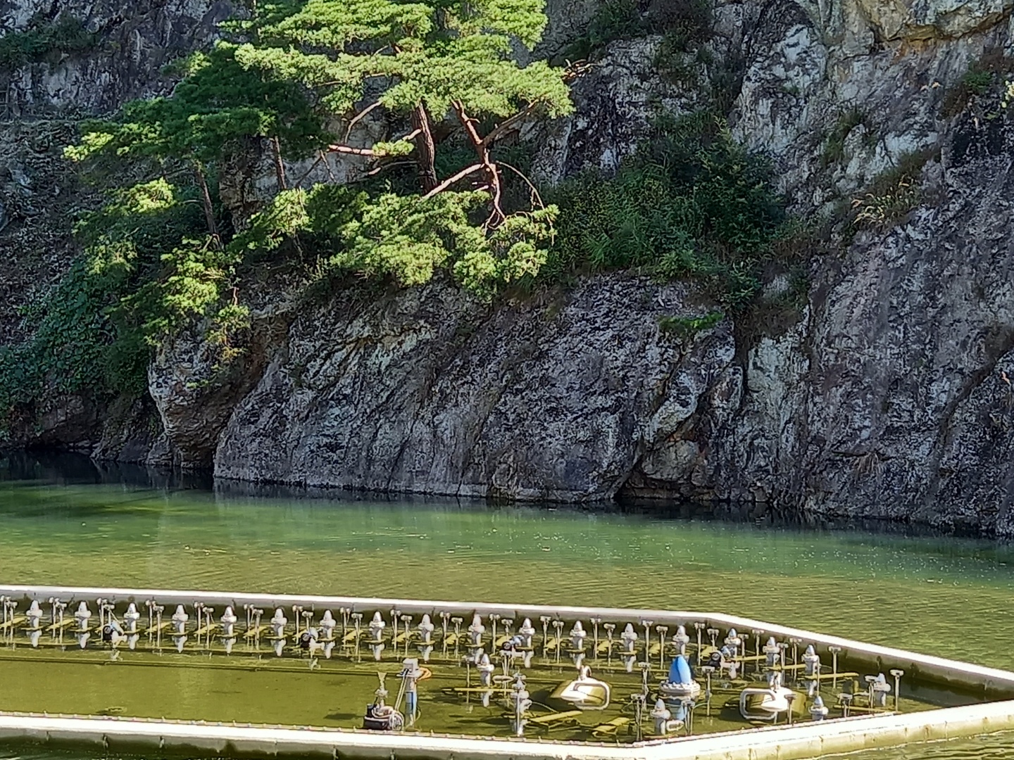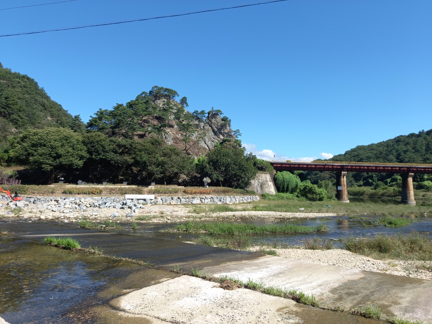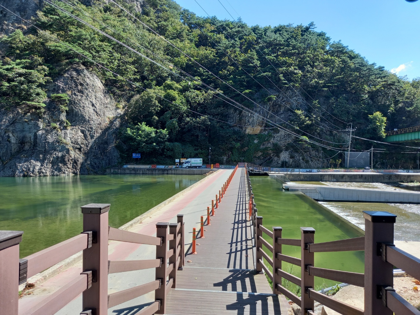 멀리 출렁다리가 가늘게 보였다. 건너가는 사람들 모습도. 출렁다리를 올려다보니 꽤 높다. 로프에 매달려 산 중턱에 난 풀을 깎는 사람들도 보인다. 힘든일에 매달린 사람들이다.