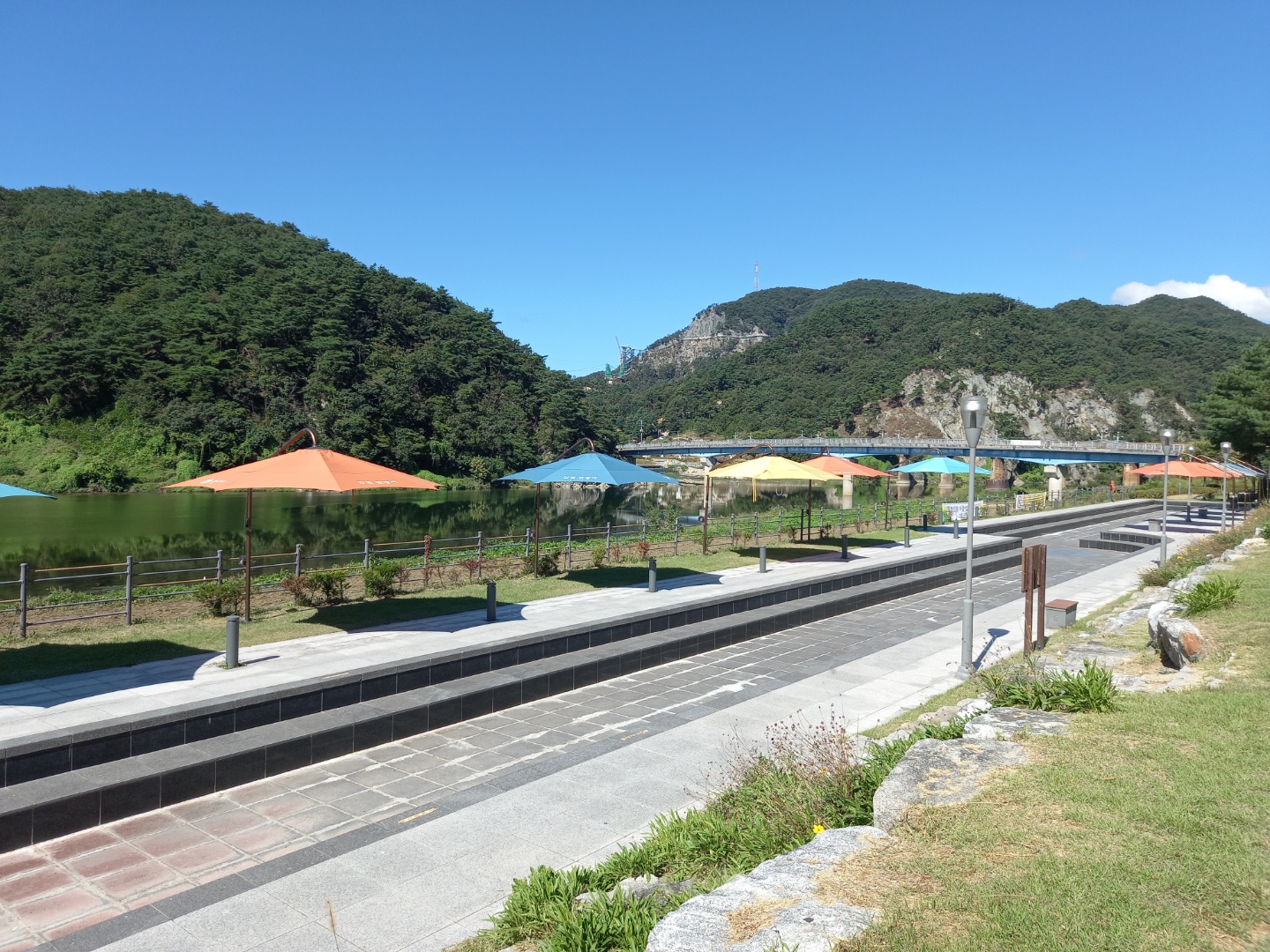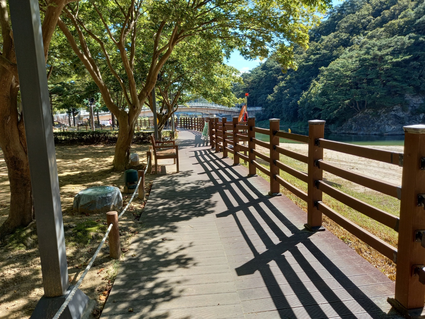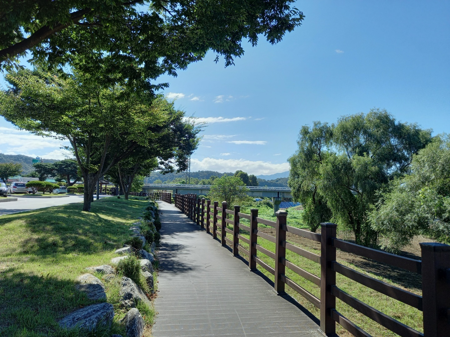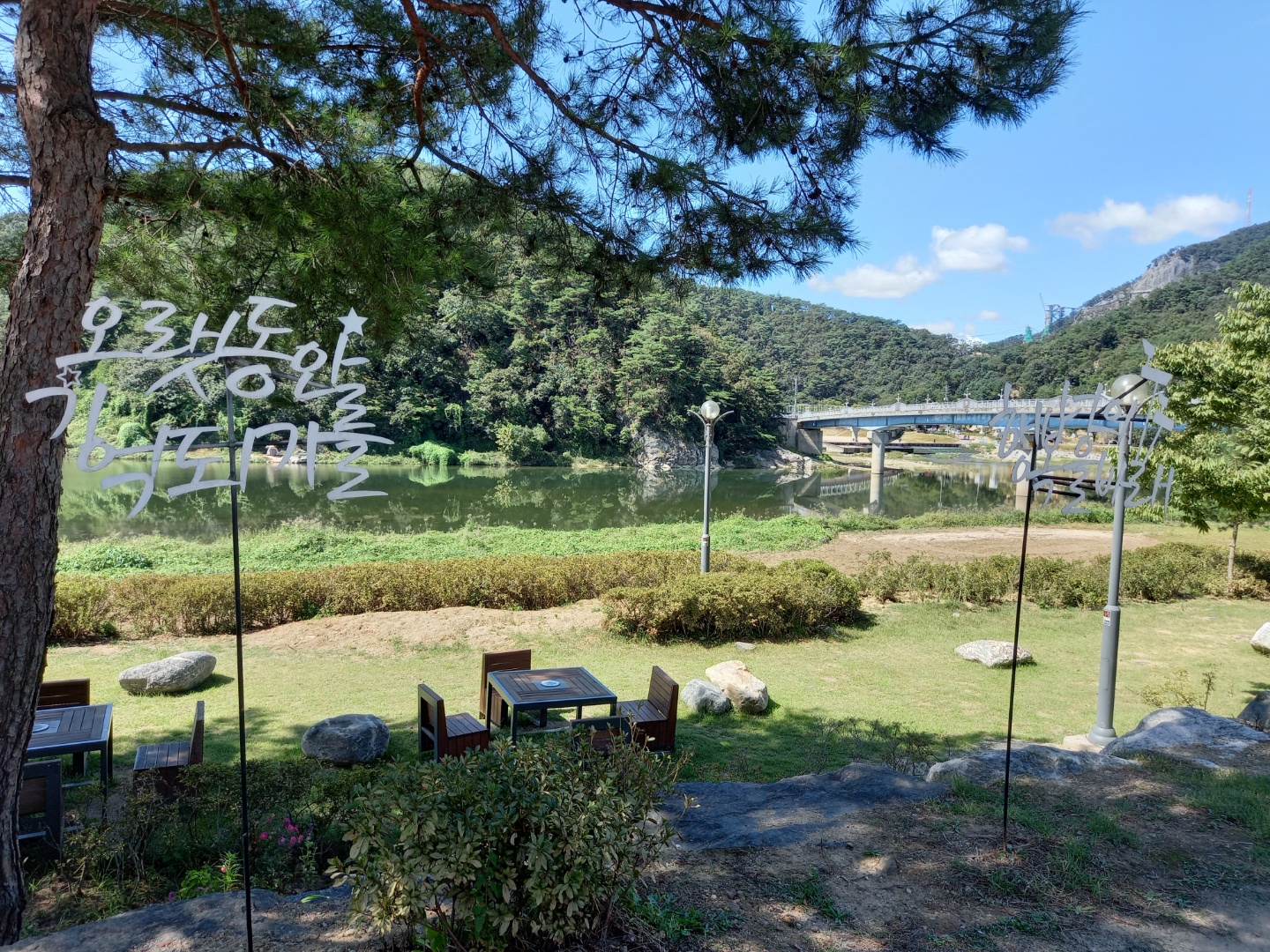 반려견과 함께 가는 길이라 자동차가 다니는 도로로 가지 않고 왼쪽에 있는 방부목으로 만든 길로 걸어갔다. 식당의 뒤편이다. 그늘도 있고 벤치도 몇 군데 있어서 산책후에 커피 마실 자리로 찜해두었다. 왼쪽편엔 섬강이 흐른다.