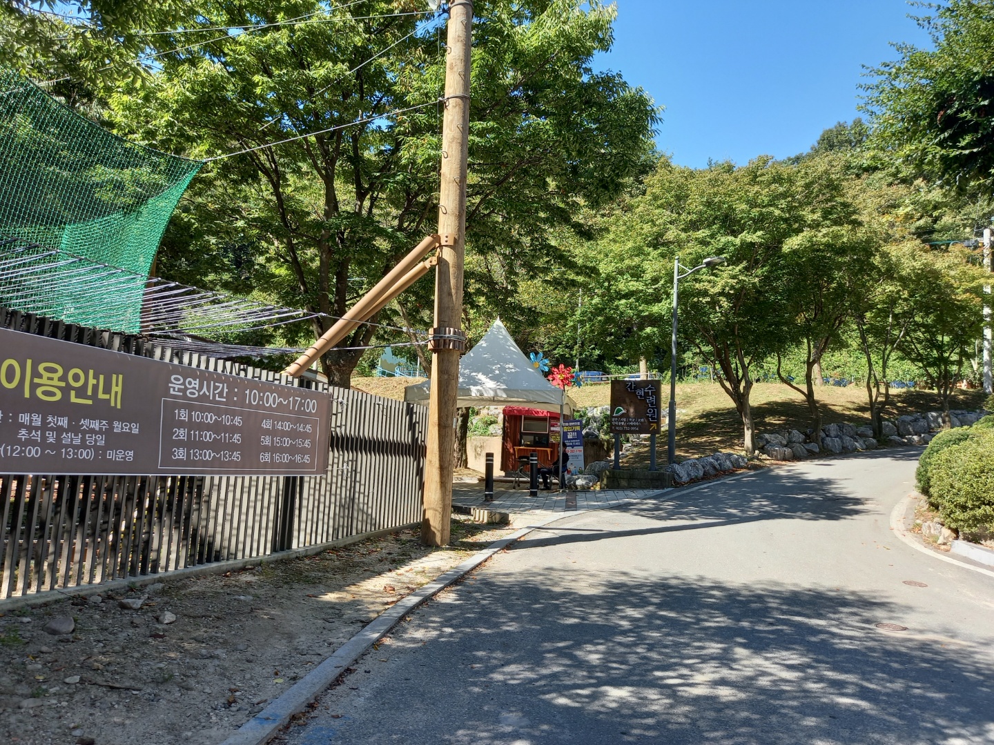 청운산장에선 주인과 몇사람이 커피를 마시고 있다. 네트 어드벤쳐라는 아이들 놀이장에선 아이들이 놀고 있다. 그물망에 올라가 논다. 지금은 무료인데 조만간 입장료를 받을 것이란다. 바로 옆에 간현수련원 입구가 있다. 물길을 따라서 돌아가며 걷는데 공사중이라 길을 막아놓았다. 계속 간다면 포레스트캠핑장까지 갈 수 있는 길이다.