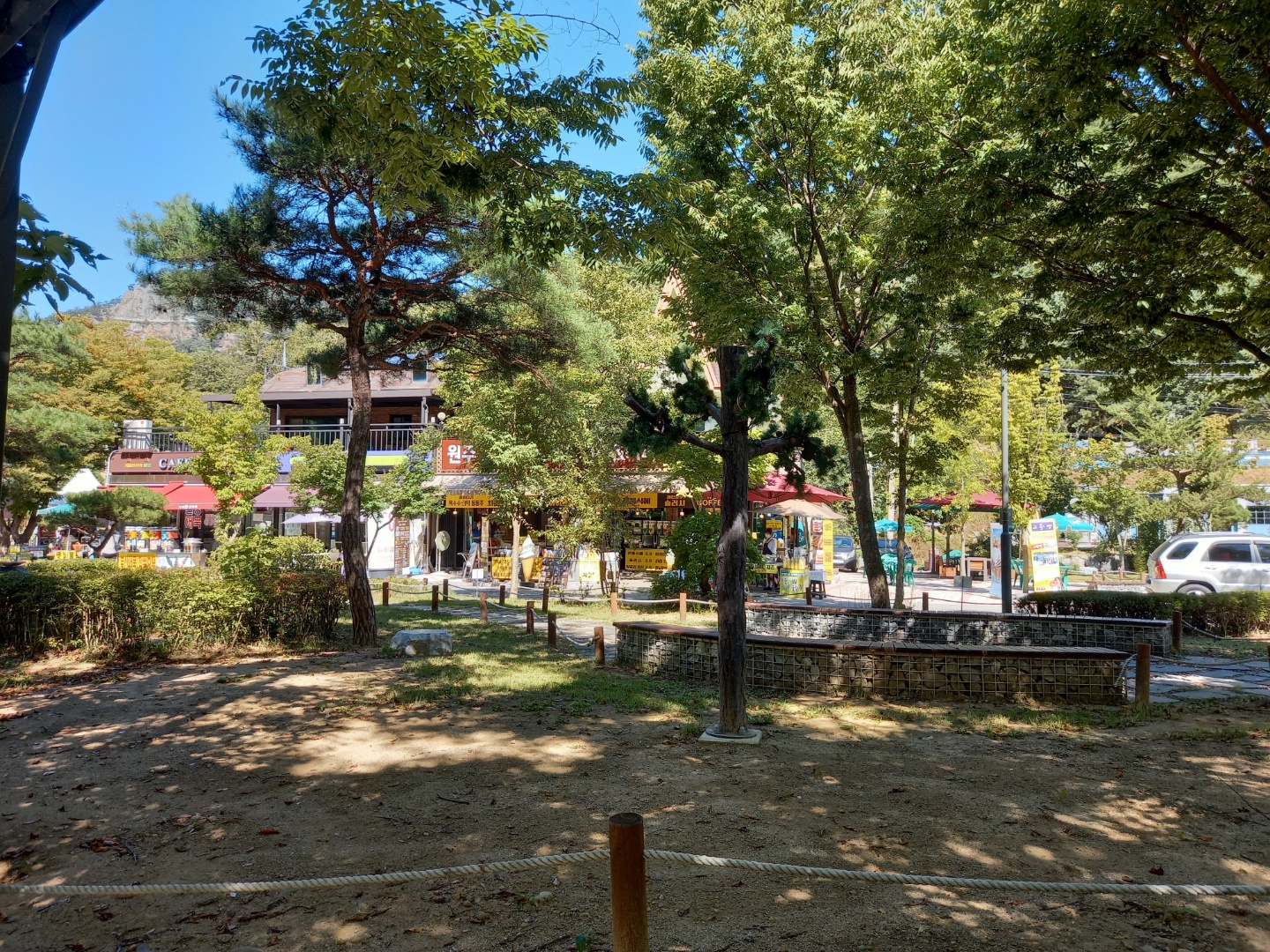 관광지답게 카페, 식당 등의 상점들이 손님을 기다리고 있다. 호두과자를 파는 곳도 있고 시골집이라는 식당도 보인다.