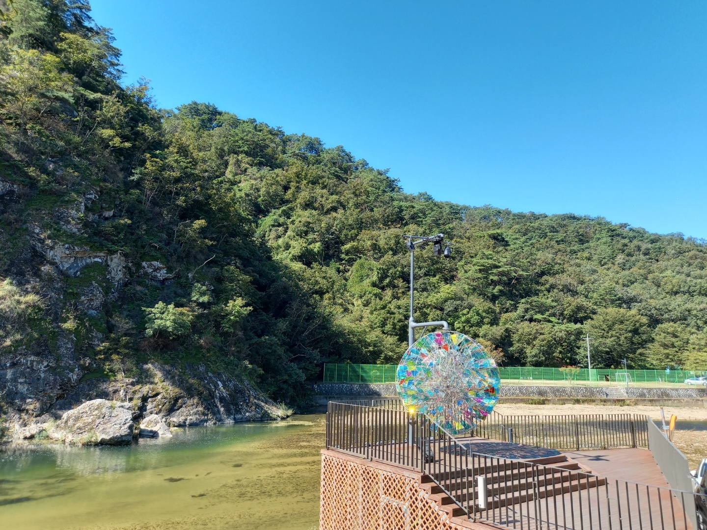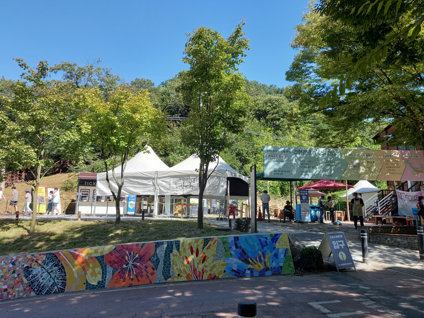 소금산 출렁다리로 올라가는 입구에서 입장표를 받는다. 반려견을 같이 갈 수가 없다. 전에 와본 곳이라 올라갈 생각은 하지 않고 왔다. 왼쪽으로 난 길로 걸어갔다. 섬강의 지류 삼산천의 물소리를 들으며 옆에 우뚝 솟은 소금산을 바라보며 걸으니 설악산에 온듯하다.
