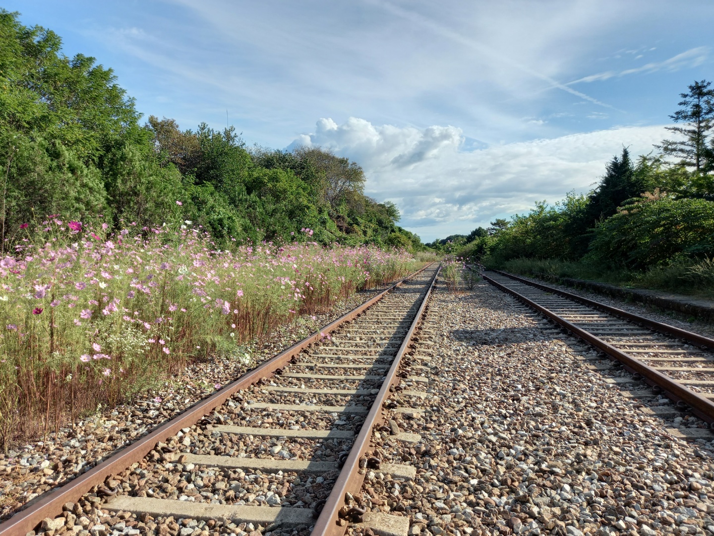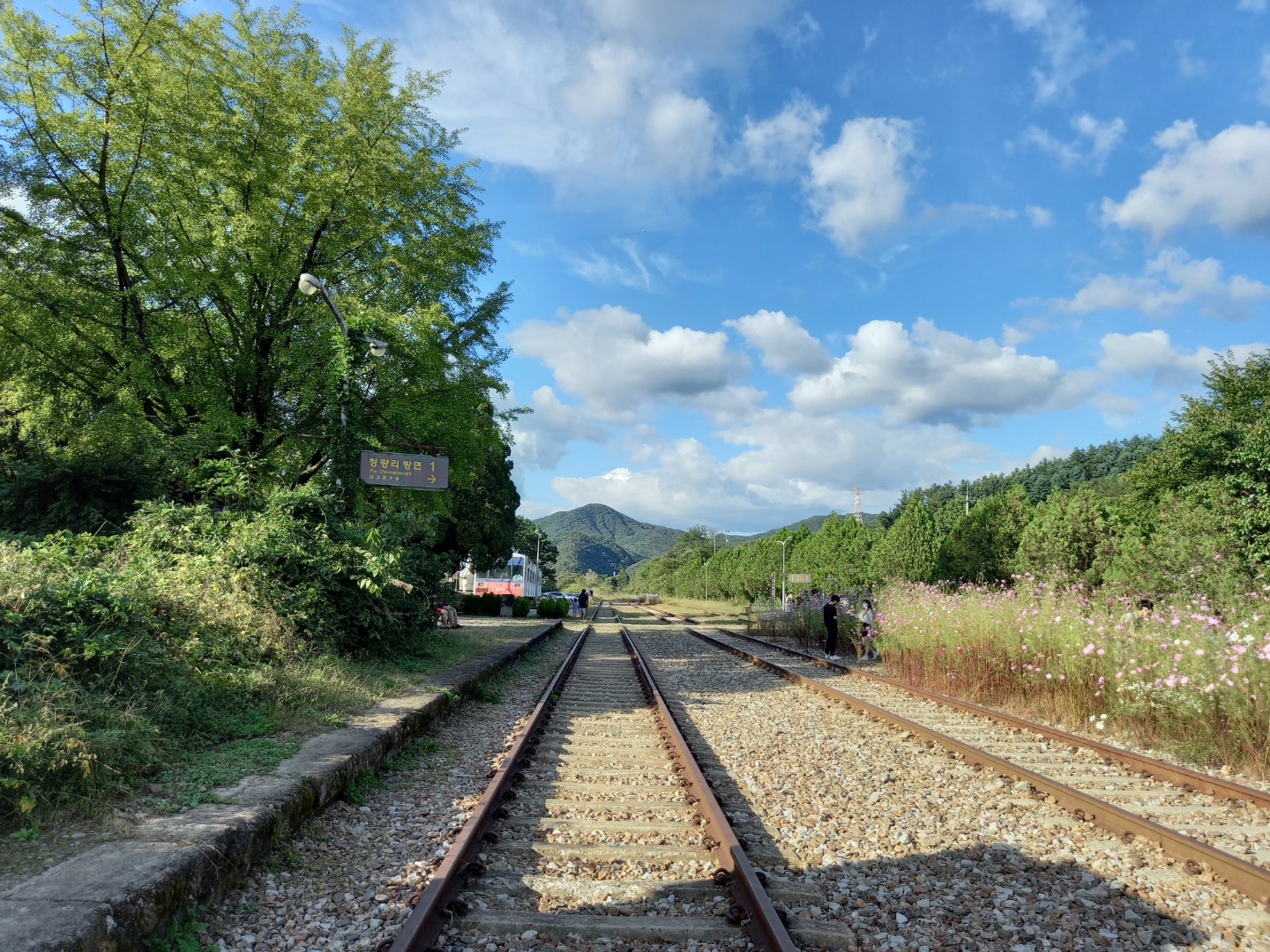기찻길 옆으로 코스모스가 하늘거려서 기찻길과 함께 사진을 찍고 싶어지게 만든다.