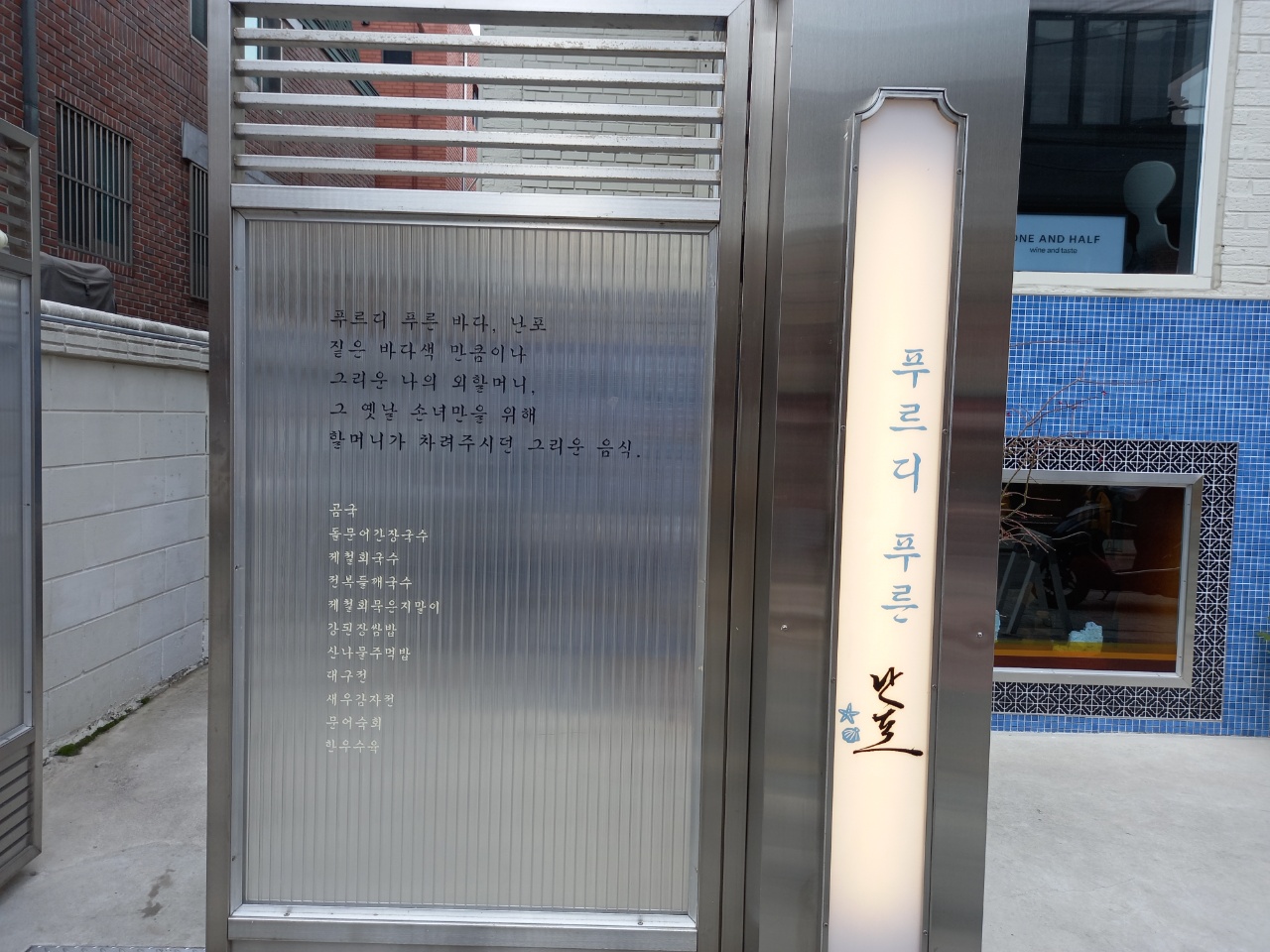 여기도 위층과 똑같이 예약시스템이 잘 되어 있고 전화연락 받고 들어가느라 좀 기다렸다. 젊은 남자 셰프가 준비하는 것은 위층과 비슷하다. 강된장쌈밥 새우감자전 대구전을 시켰는데 밥을 먹은 것 같지 않다. 쌈밥에는 강된장이 적어서 쌈밥이 싱거웠다. 따뜻하게 먹는 국물 곰국을 시키지 않아서 그런지 속이 시원하지가 않았다. 가격은 쌈밥은 10000원이나 전은 18000원이다. 국수 종류도 있고 전통주도 판다. 조금이라도 요리를 시킬 때 된장국물이라도 나왔으면 좋겠다.
