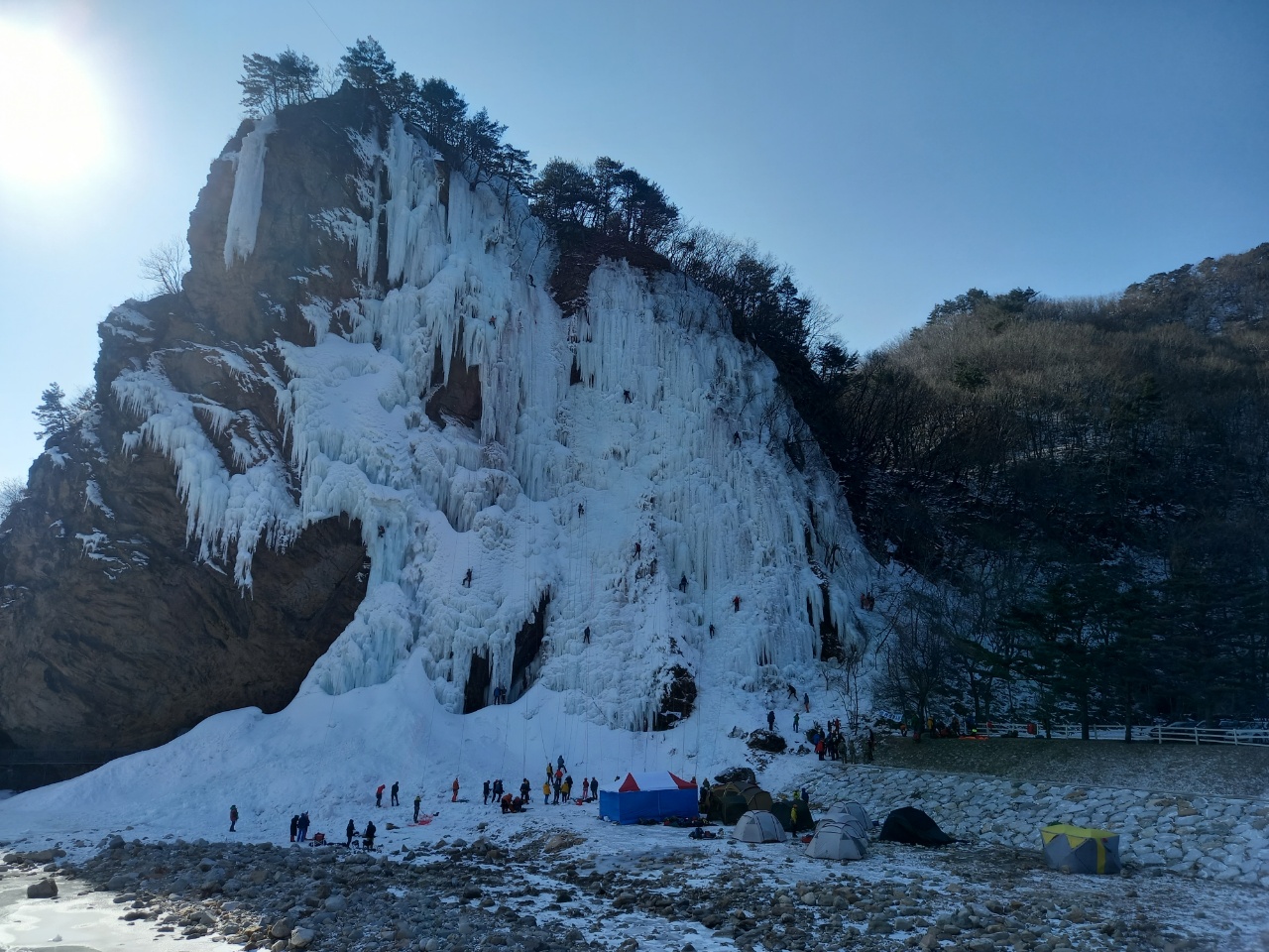 매바위인공폭포에 갔다. 하얗게 얼어있다. 흘러내린 두꺼운 갑옷을 걷어내려고 많은 사람들이 폭포 밑에서 도전장을 내민다. 텐트를 치고 짐을 챙기고 각오를 챙긴다.