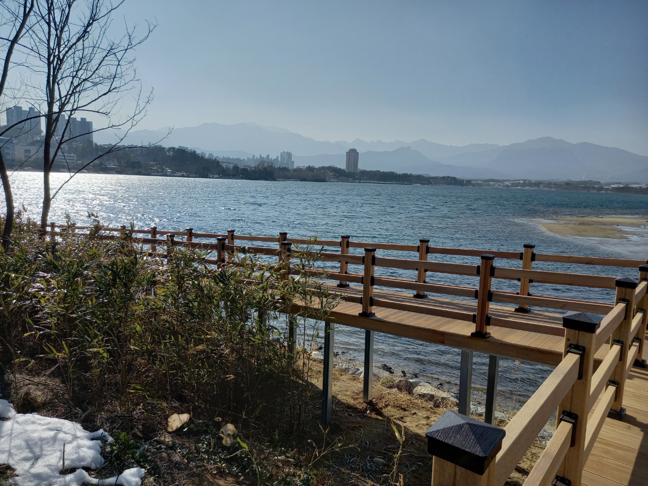 속초에서 가까운 고성의 청간정 콘도에 묵을 예정인데 아직 시간이 남아서 영랑호에 먼저 갔다. 호수둘레길을 만드는 중이다. 호수 전체는 거리가 좀 된다. 두 개의 코스로 나눠져 있다. 나는 데크로 만든 길만 왕복했다. 통천군순국동지충혼비까지 갔다가 되돌아오는 길이었다. 다음에는 다른 코스를 걸어볼 것이다.
