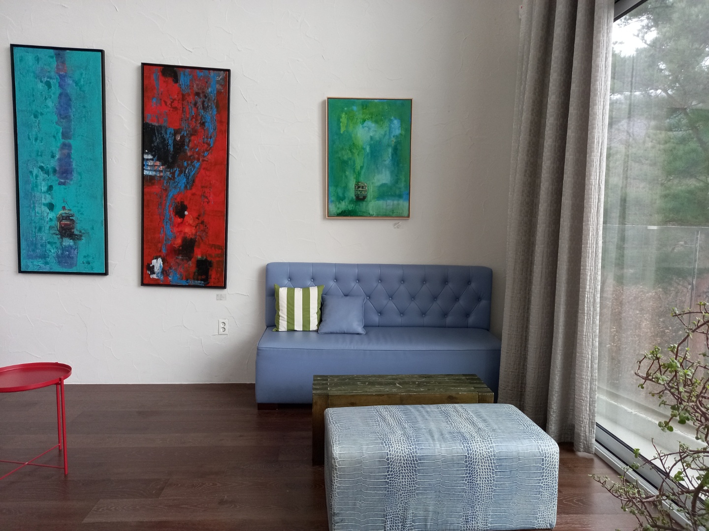 음료를 들고 다시 계단을 오르니 단순하나 잘 꾸며진 정원이 있다. 실내에 들어서니 그림액자들과 자유롭게 앉아서 차를 마실 수 있는 소파들을 배치했다. 밖을 끌어들이는 창문유리의 모양도 창밖에 W자와 비슷한 모양을 한 번 더 설치하여 다양한 모습을 보이니 예사롭지 않다. 부드러운 세모 모양의 골조로 보이는 소나무와 강과 산...