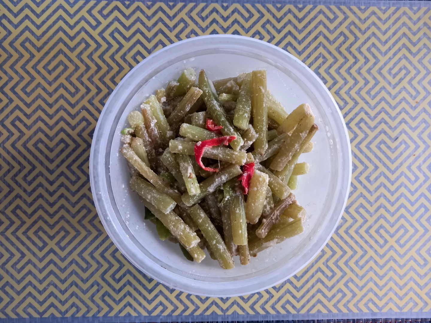 5센치 길이로 자른 대를 기름 반 스푼 넣고 볶는다. 볶은 후에 마늘과 소금을 넣어 볶다가 물을 조금 넣어 볶는다. 불을 끈 후에 들깨가루를 넣는다.