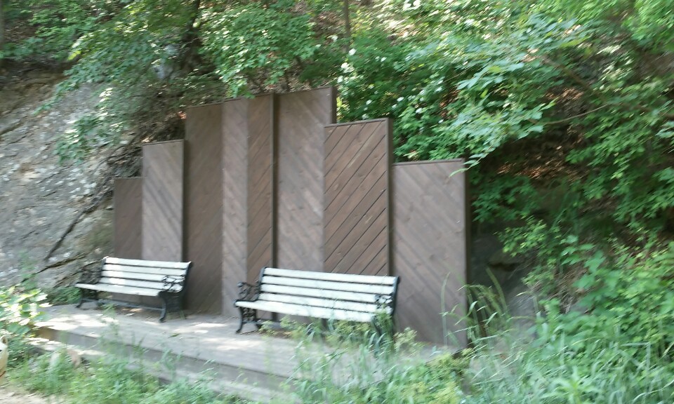 산길에 웬 뒤가림막이 있는지. 위험방지를 위한 것인가. 그래도 의자에 앉아 사진을 찍으니 편안하고 새롭다. 산중옛길 코스를 임도로 해놔서 차량이 지나갈 정도로 길이 넓다. 또 다시 쉼터가 있어서 유치원 아이들을 데리고 온 가족들이 쉬고 있어서 나는 그냥 지나쳤다. 비를 피할 수 있도록 지붕이 있는 쉽터여서 김밥이나 간식을 먹으면서 쉴 수 있는 곳이다.