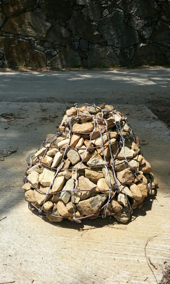 틈을 내서 시작한 것이 구부리기 좋은 분재철사를 이용하는 것이다. 소나무를 전지하고난 후 모양을 만들고 남은 알루미늄선이 생각났다. 손가는 대로 엮어보니 주머니 모양이 되었다. 그곳에 쌓아놓은 돌멩이들을 넣어가며 작품을 만들어 보았다. 만두모양이 되어갔다.