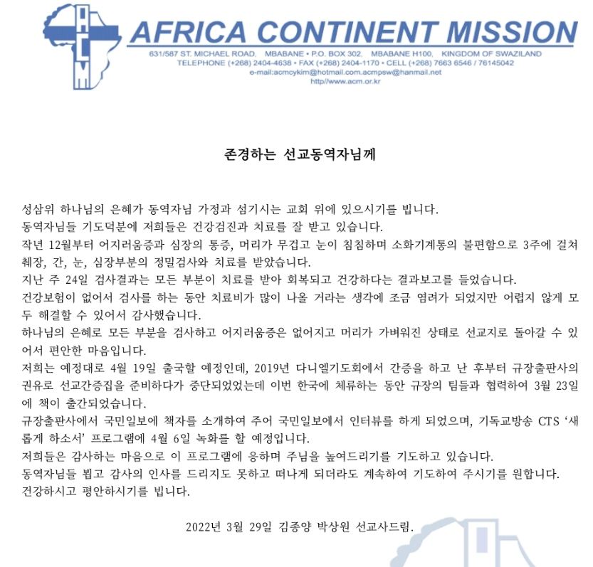 김종양 박상원 선교사 선교편지(3월 29일) 신앙간증집 도서출판